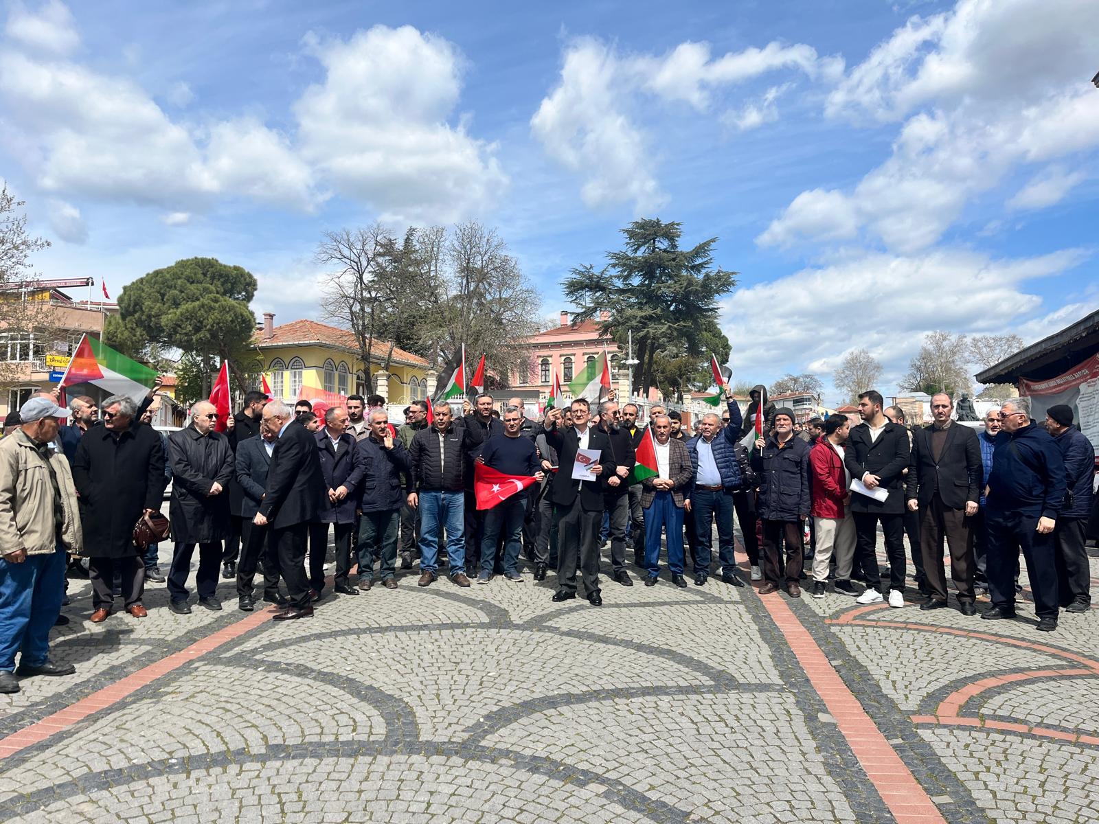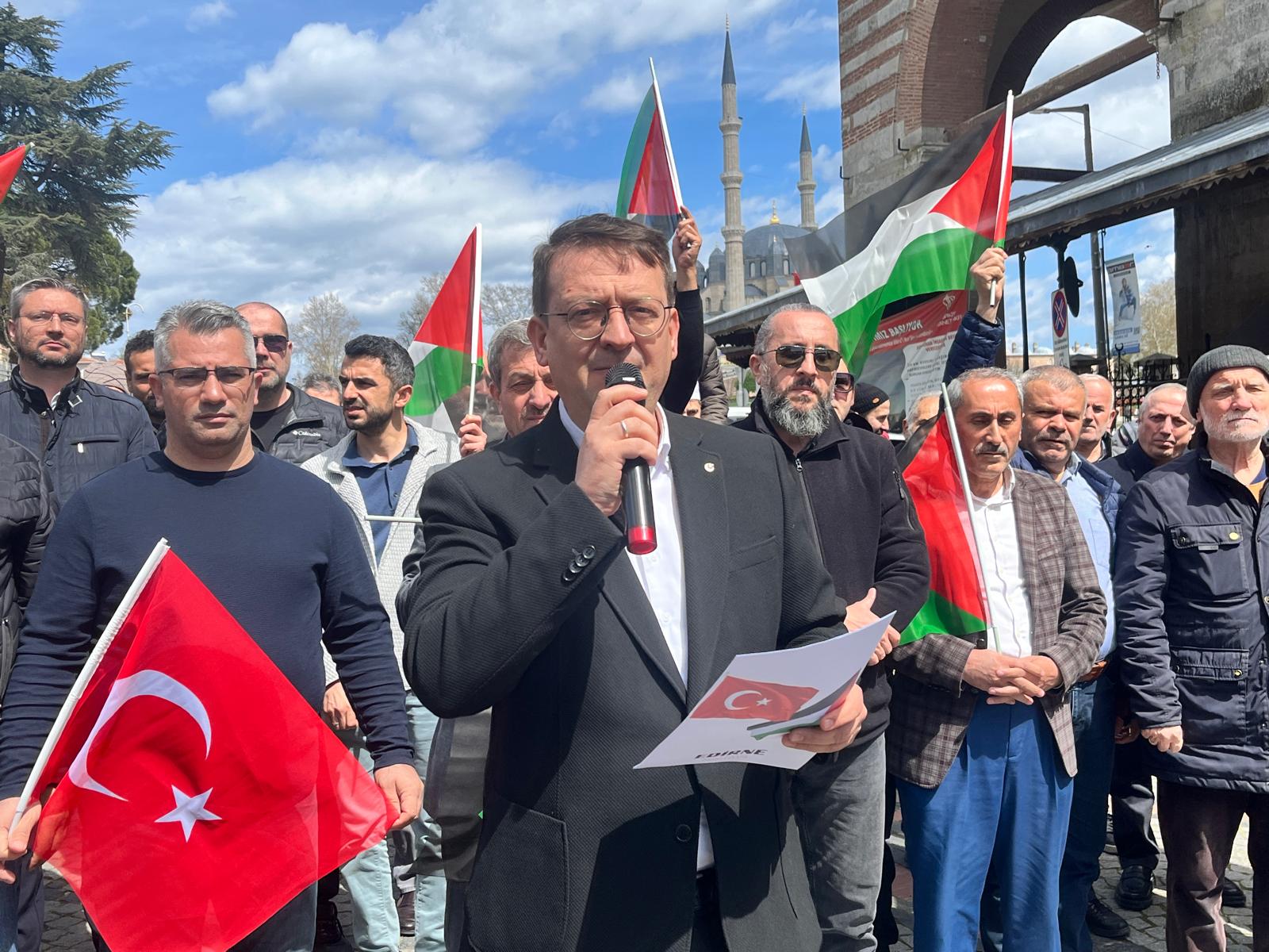 Anadolu Gençlik Derneği (AGD) Edirne Şubesi üyeleri, İsrail’in Gazze ve Filistin’de sürdürdüğü saldırılara karşı Edirne’de öğle namazı çıkışı Eski Cami önünde bir araya gelerek tepki gösterdi.