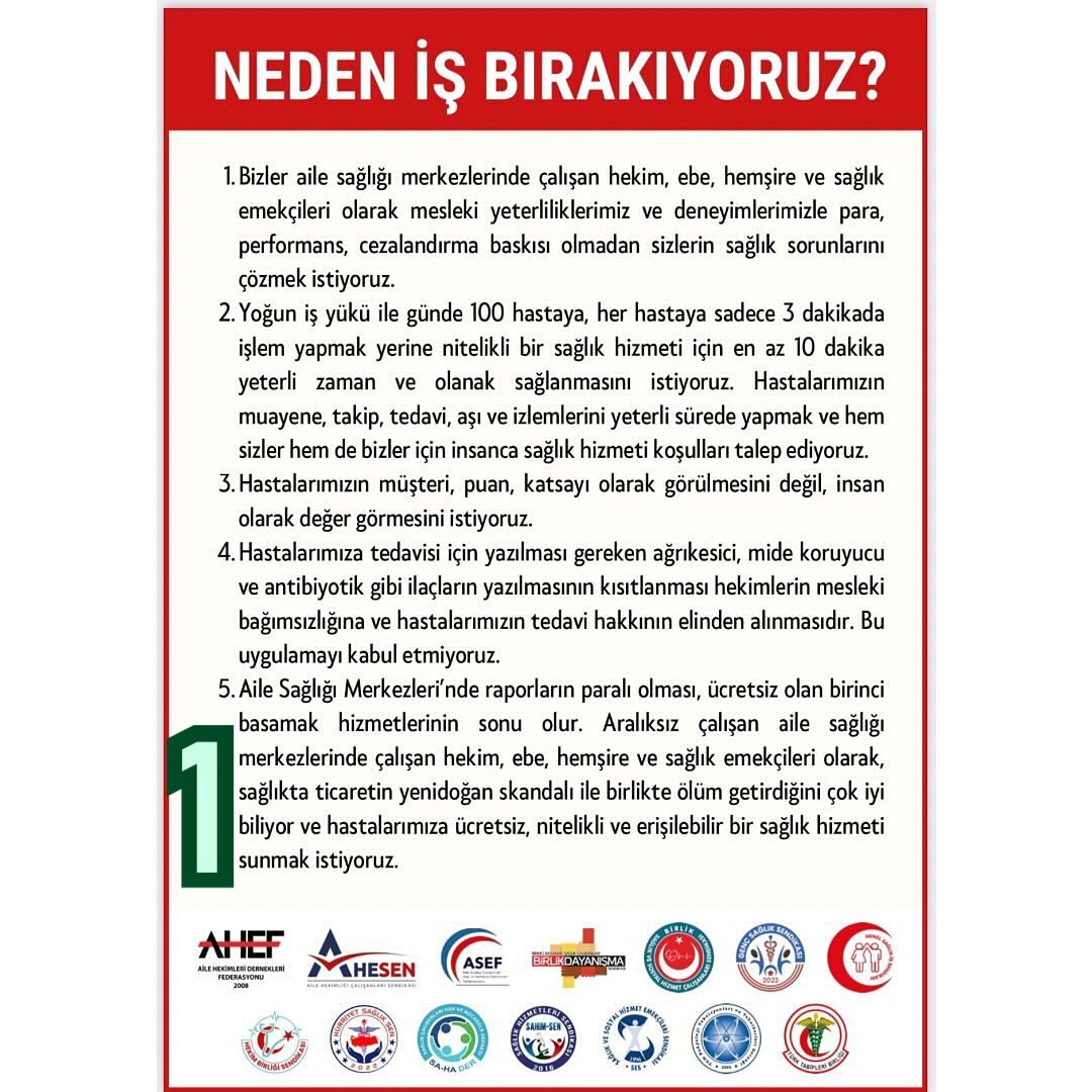 “1. Bizler aile sağlığı merkezlerinde çalışan hekim, ebe, hemşire ve sağlık emekçileri olarak mesleki yeterliliklerimiz ve deneyimlerimizle para, performans, cezalandırma baskısı olmadan sizlerin sağlık sorunlarını çözmek istiyoruz.