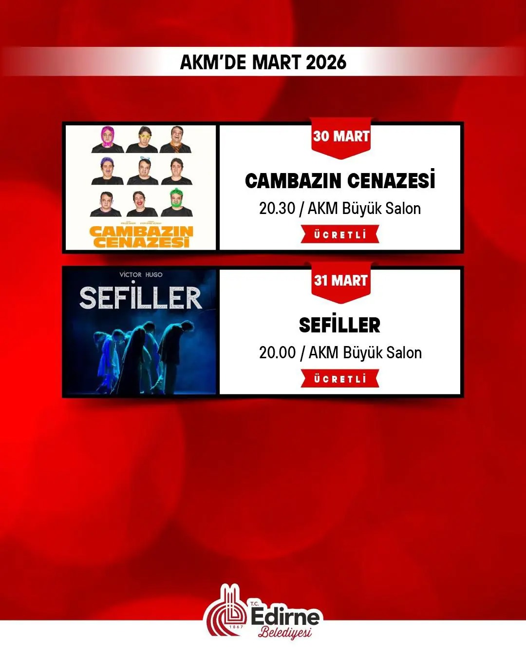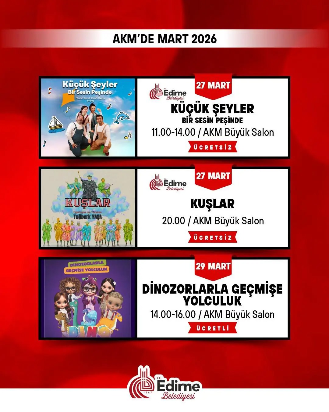 Edirne Belediyesi, 2026 yılı Mart ayı kültür sanat takvimini kamuoyuyla paylaştı. Atatürk Kültür Merkezi ve Belediye Konservatuvarı ev sahipliğinde gerçekleşecek program; tiyatrodan konsere, çocuk gösterilerinden dünya klasiklerine uzanan zengin içeriğiyle sanatseverleri buluşturacak.