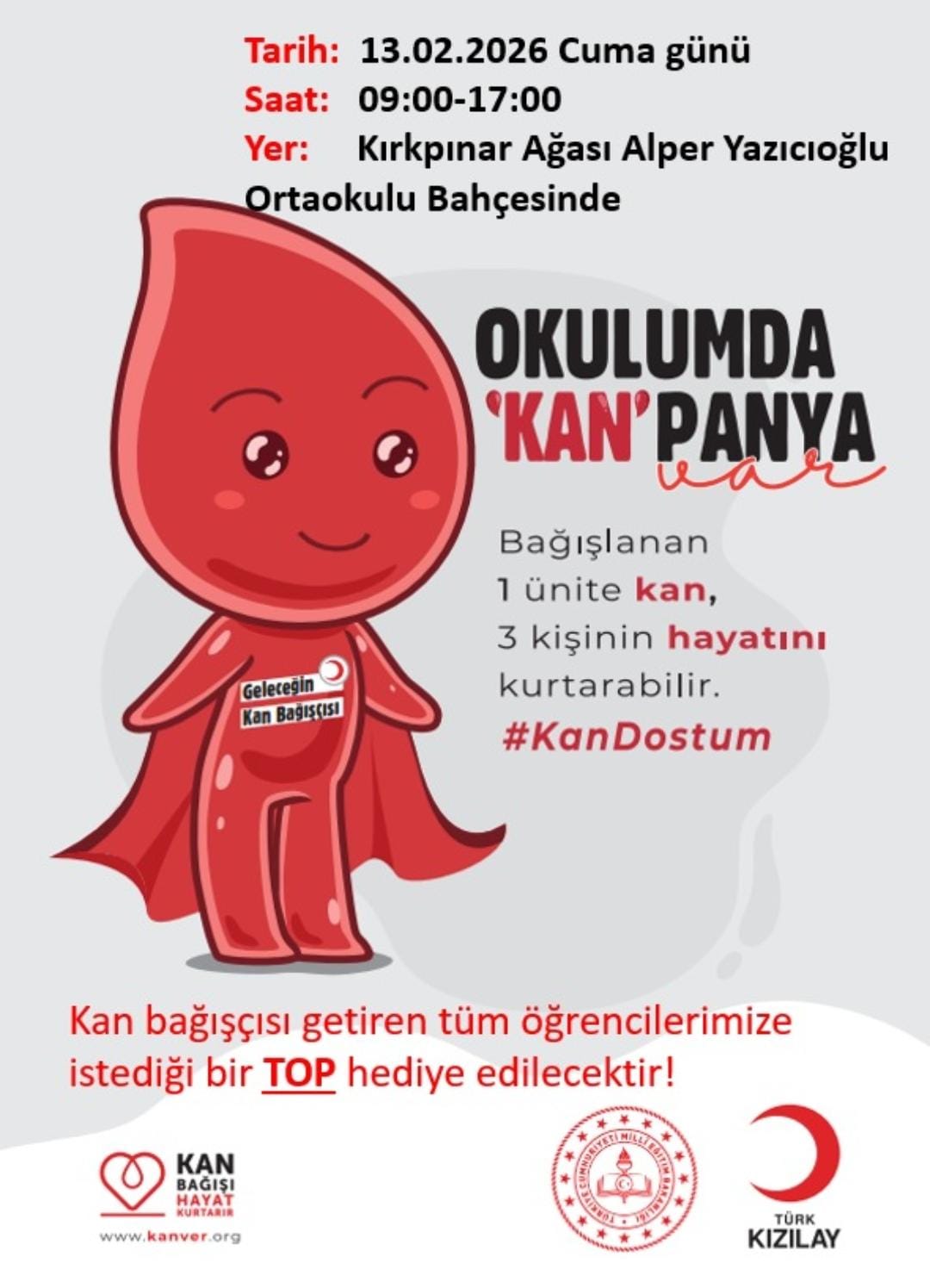 Türk Kızılayı, 13 Şubat 2026 Cuma günü saat 09.00 ile 17.00 arasında Kırkpınar Ağası Alper Yazoğlu Ortaokulu bahçesinde kan bağış kampanyası gerçekleştirecek. Kampanya öncesi Kızılay yetkilileriyle bir araya gelen Kocasinan Mahallesi Muhtarı Canan Koca ile Fatih Mahallesi Muhtarı Bilal Ürer vatandaşları kan bağışında bulunmaya çağırdı.