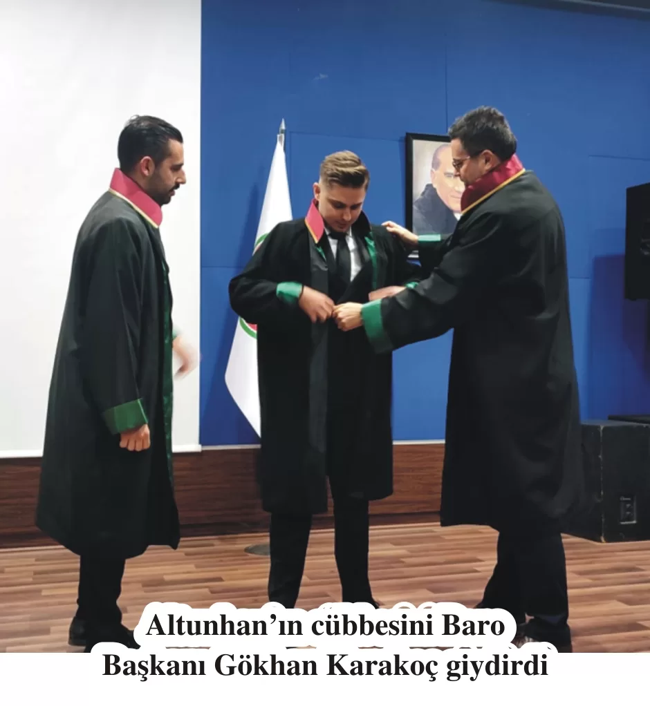 Edirneli iş insanı Gökhan Altunhan’ın oğlu Batıkan Altun-han, tamamladığı staj döneminin ardından Edirne Barosu’nda düzenlenen törenle avukatlık mesleğine adım attı. Törende Altunhan’ı ailesi ve meslektaşları yalnız bırakmadı. Meslek yemini eden Batıkan Altunhan’a, yanında staj yaptığı Avukat Caner Eygül ve Baro Başkanı Gökhan Karakoç tarafından avukatlık cüppesi giydirildi, Baro Başkan Vekili Avukat Aygün Ulubey Ergüden tarafından avukatlık ruhsatı takdim edildi. Törene Edirne Baro Başkanı Gökhan Karakoç, Enez Belediye Başkanı Özkan Günenç, Edirne Belediye Başkan Yardımcısı Hakan İşcan, Edirne Ticaret ve Sanayi Odası Yönetim Kurulu Başkanı Sezai Irmak da katıldı