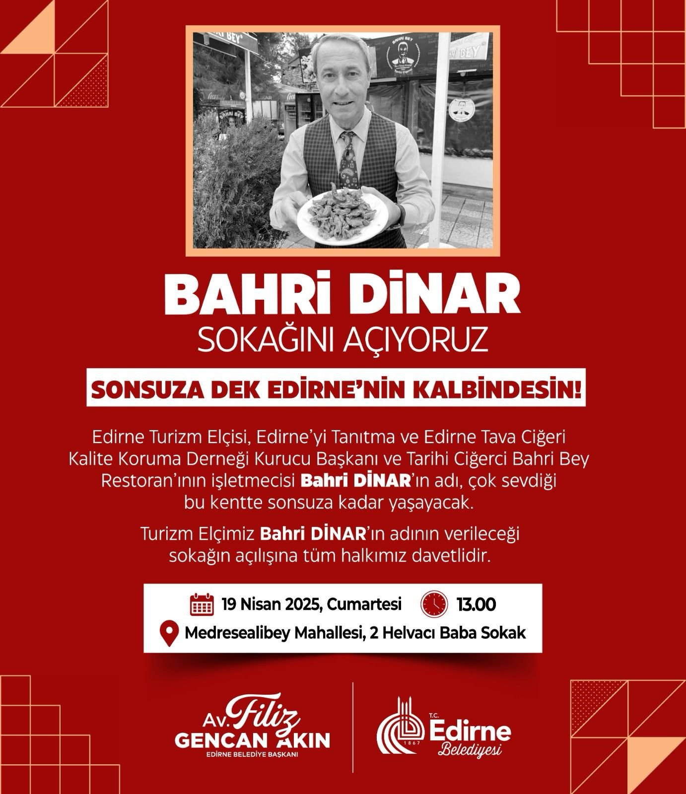 Edirne’nin tanıtımına büyük katkılar sunan, kentin simge isimlerinden Bahri Dinar’ın adı, 19 Nisan Cumartesi günü saat 13.00’te, Medresealibey Mahallesi 2. Helvacı Baba Sokak’ta gerçekleştirilecek törenle yaşadığı sokağa verilecek.