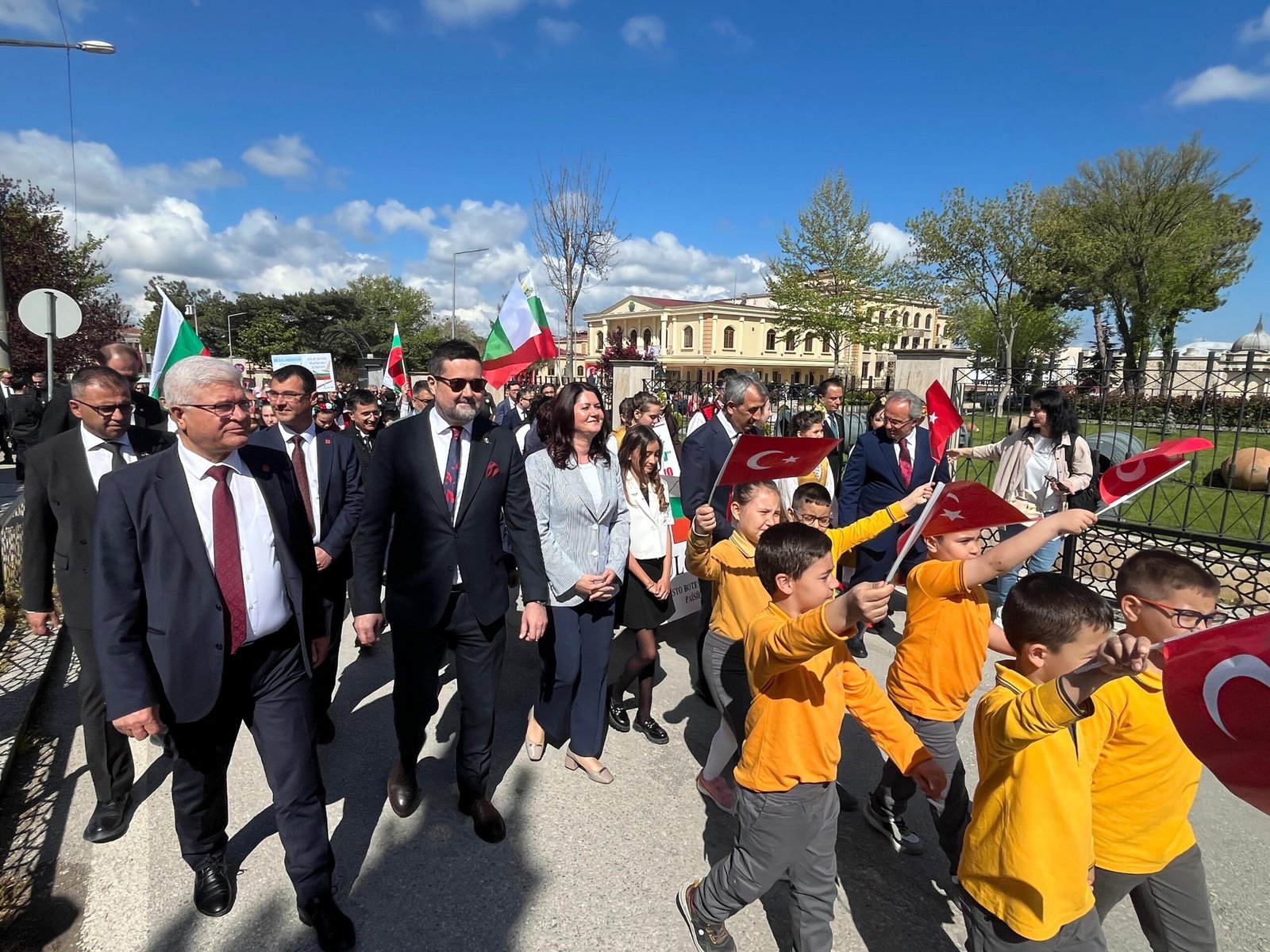 Valilikteki programın ardından, Balkan ülkelerinden katılan öğrencilerle birlikte kortej eşliğinde Atatürk Anıtı’na geçildi. Atatürk Anıtı’na çelenklerin konulduğu törende öğrenciler adında Mira Naz Çalışkan konuştu. Çalışkan, 23 Nisan’ın sadece bir çocuk bayramı değil aynı zamanda milletin egemenliğini ilan ettiği, özgürlük ve bağımsızlık yolunda attığı en büyük adımlardan biri olduğunu söyledi.
