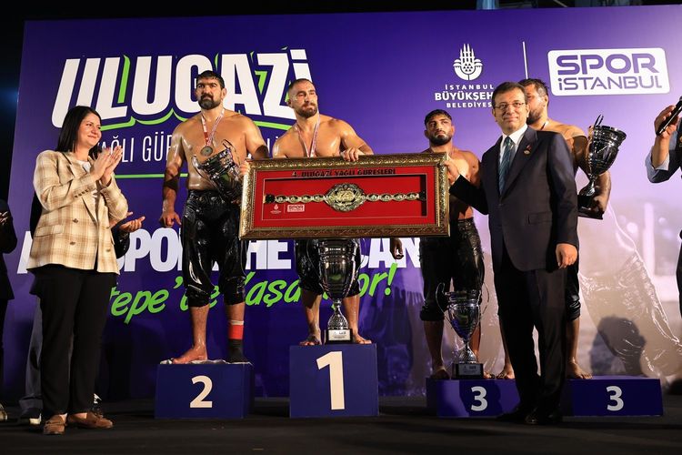 Konuşmasının ardından İmamoğlu’na, 4 yıldır Ulugazi Yağlı Güreşleri’nin yapılmasına sağladığı destekten dolayı, Türkiye Geleneksel Güreşler Federasyonu Başkanı İbrahim Türkiş tarafından sembolik altın kemer sunuldu.