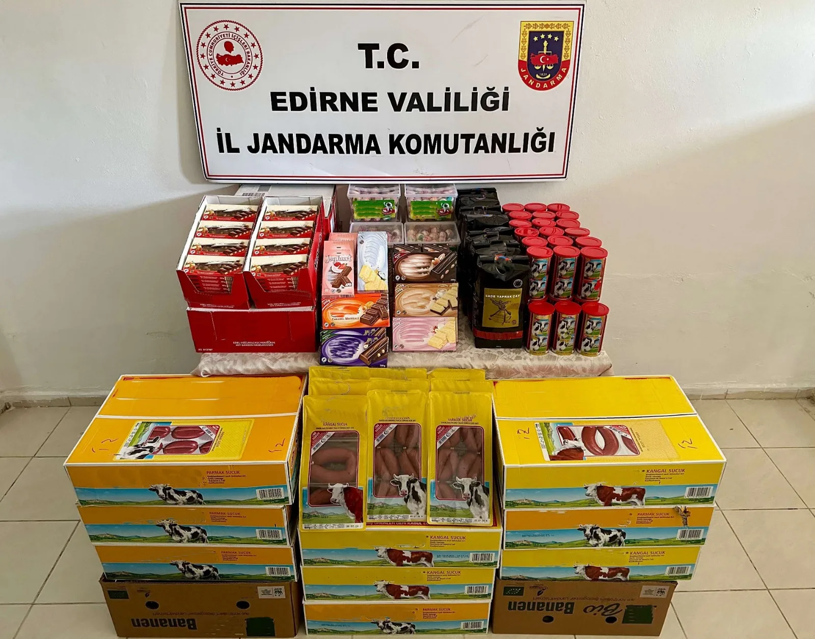 2 bin 612 adet çikolata, 24 kutu şekerleme, 173 kg sucuk, 10 kg çay, 44 paket sosis ele geçirilerek el konulmuş olup olay ile ilgili olarak Cumhuriyet Savcısının talimatıyla 1 şüpheli şahıs hakkında adli tahkikata yapılmıştır.