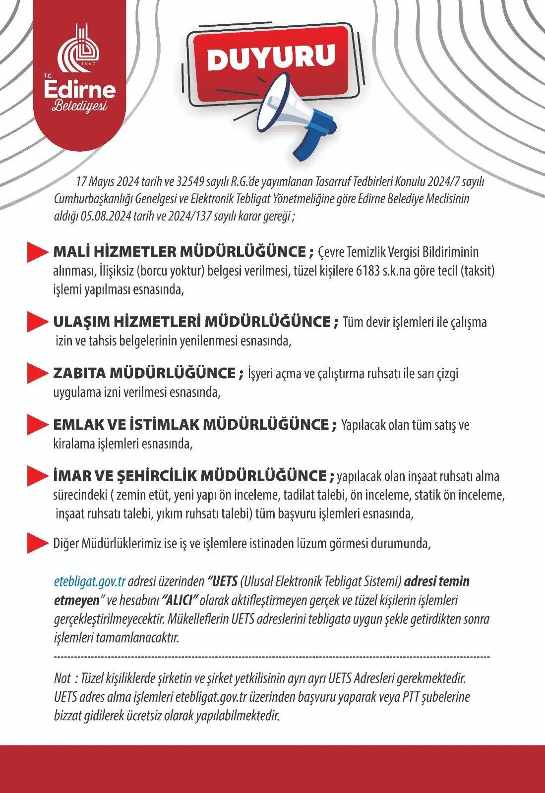 “17 Mayıs 2024 tarih ve 32549 sayılı Resmi Gazetede yayımlanan Tasarruf Tedbirleri konulu 2024/7 sayılı Cumhurbaşkanlığı Genelgesi ve Elektronik Tebligat Yönetmeliğine uygun olarak yeni düzenlemeler yapmış bulunmaktayız.