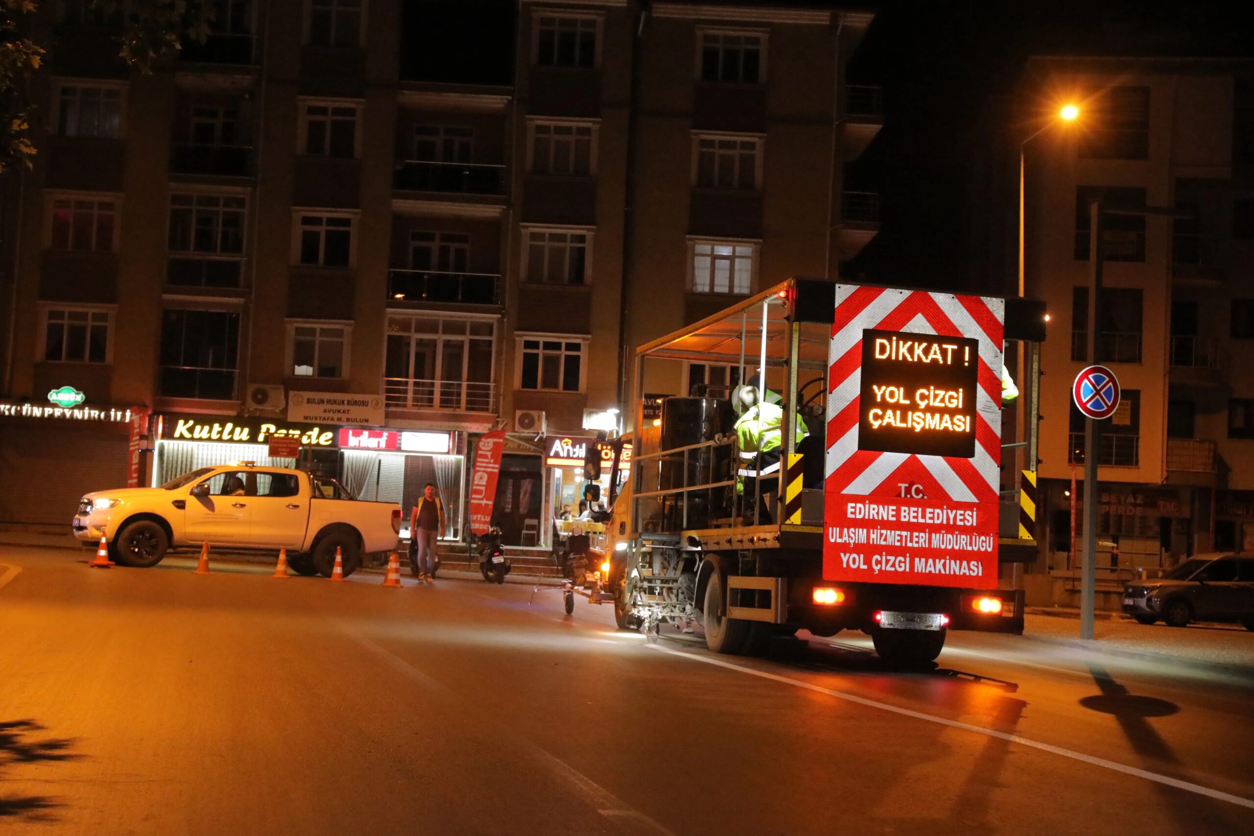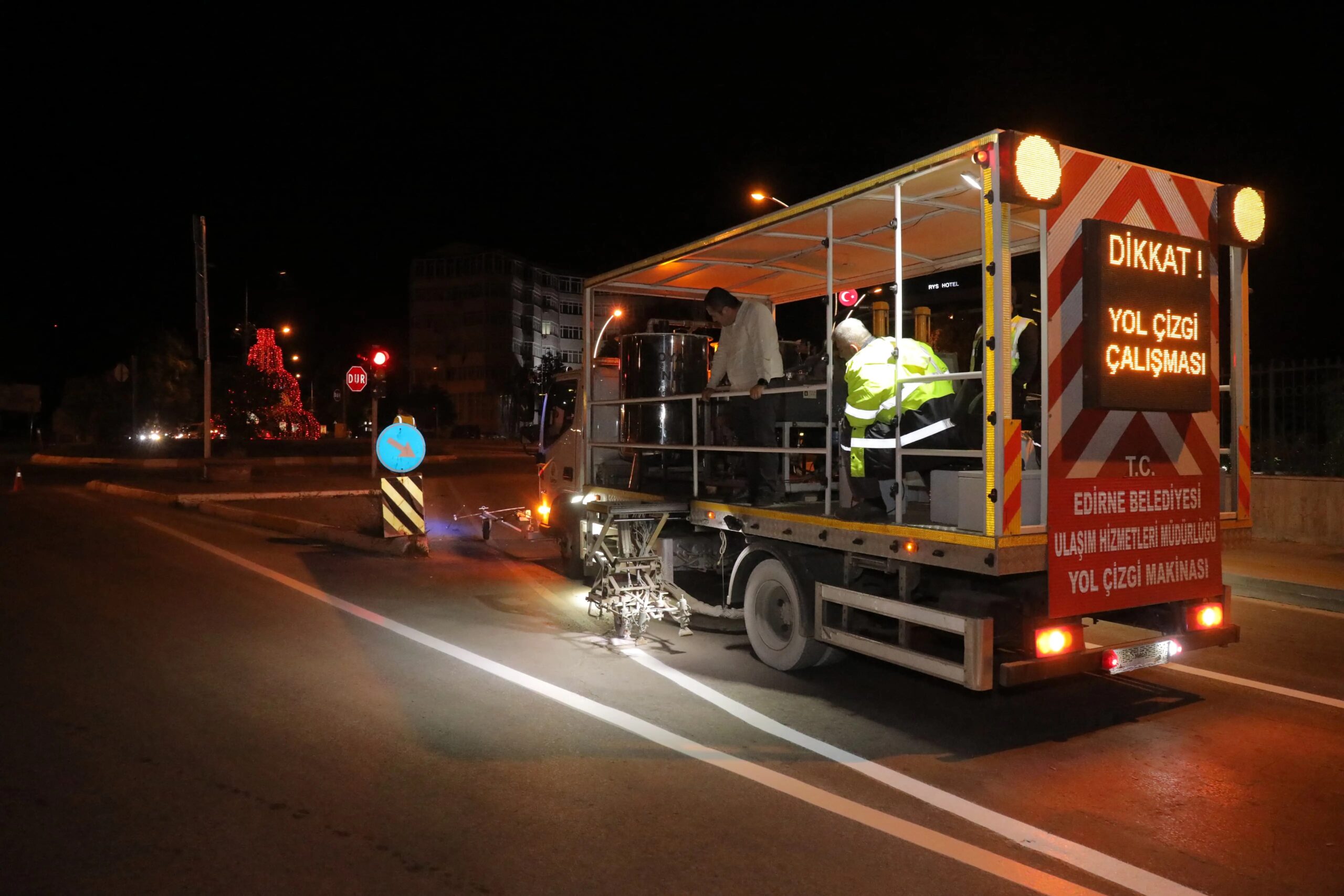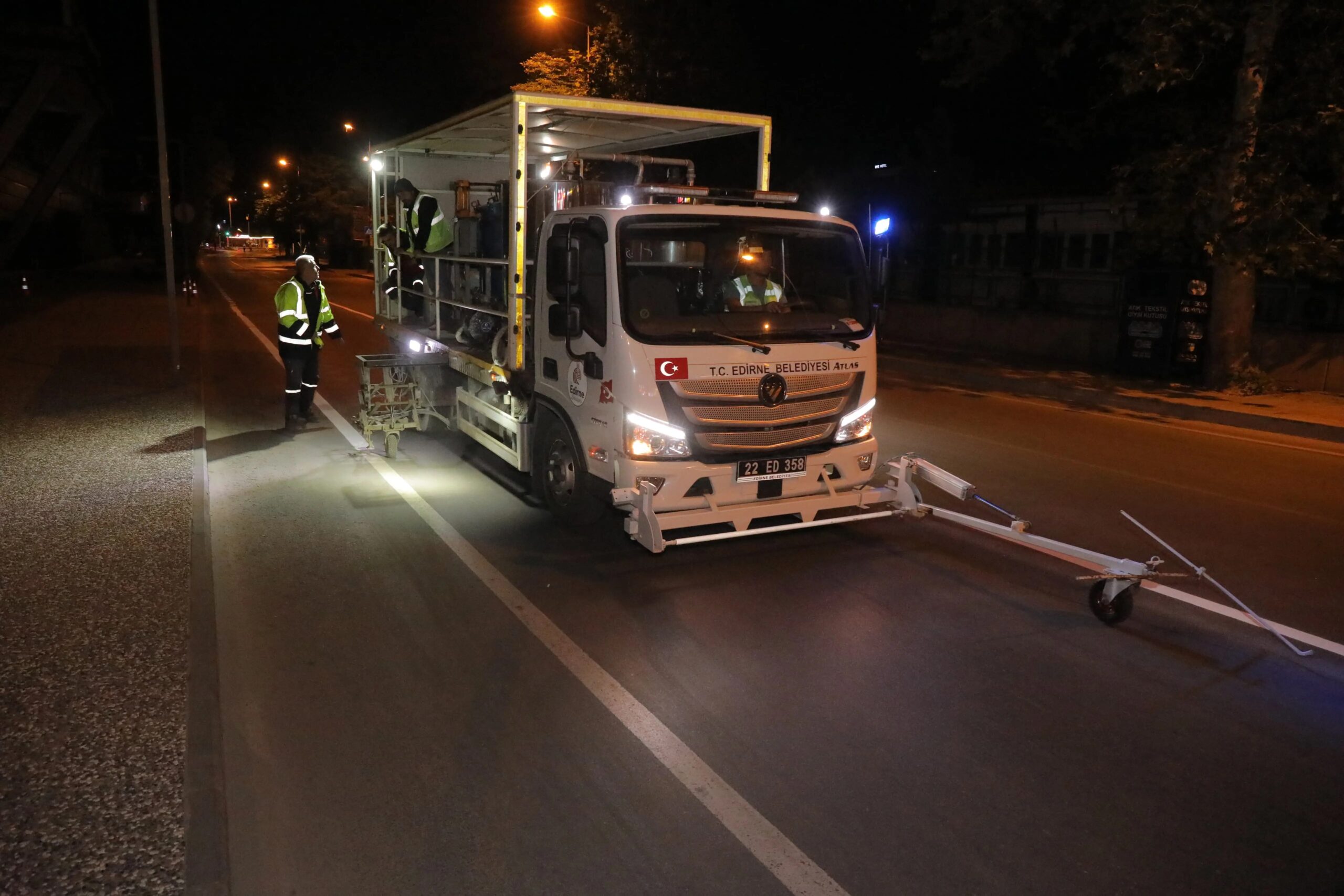 Edirne Belediyesi, kentte trafik güvenliğini artırmak ve sürücü ile yayaların ulaşımını daha konforlu hale getirmek amacıyla yol çizgi çalışmalarını aralıksız sürdürüyor.