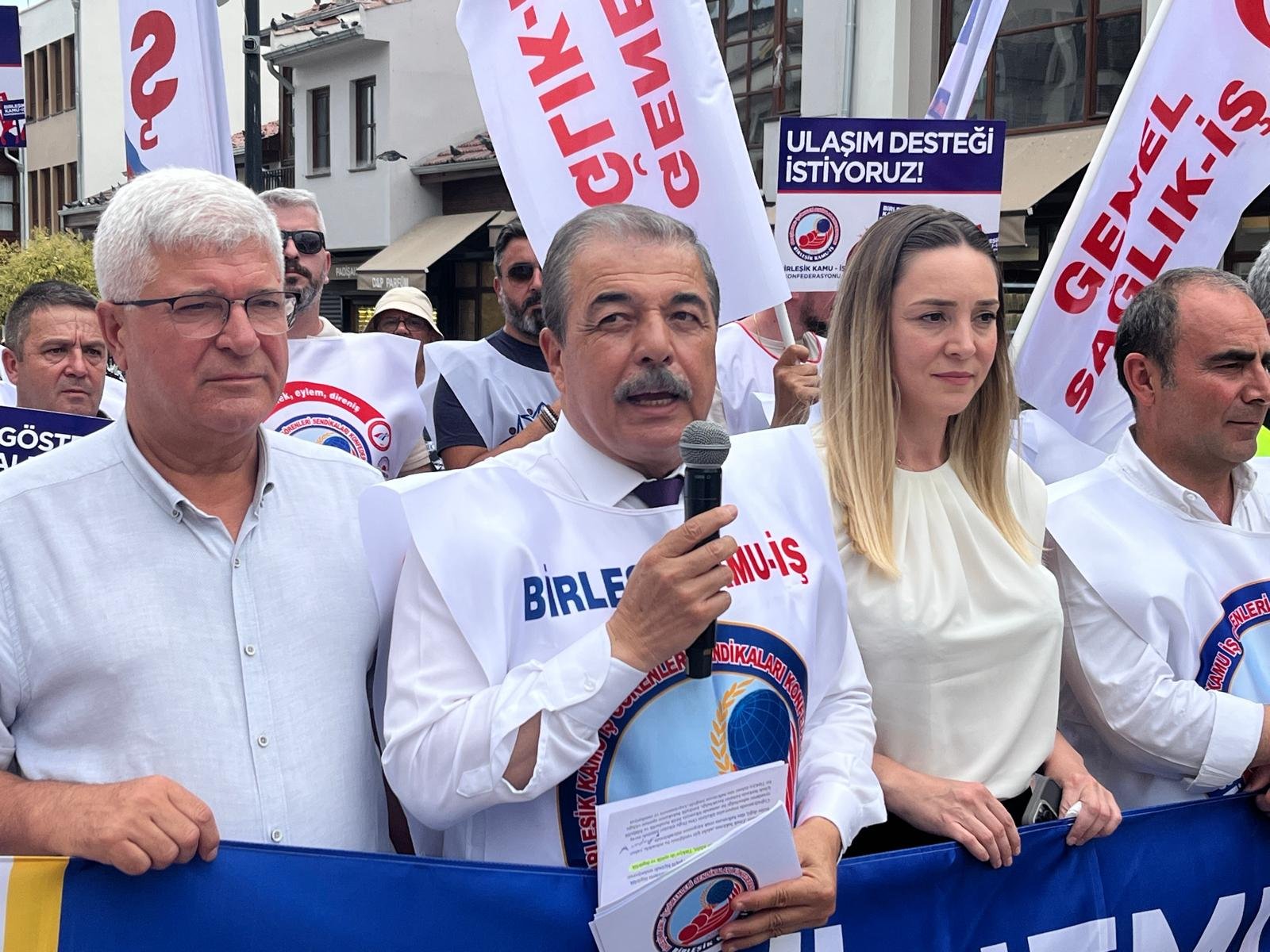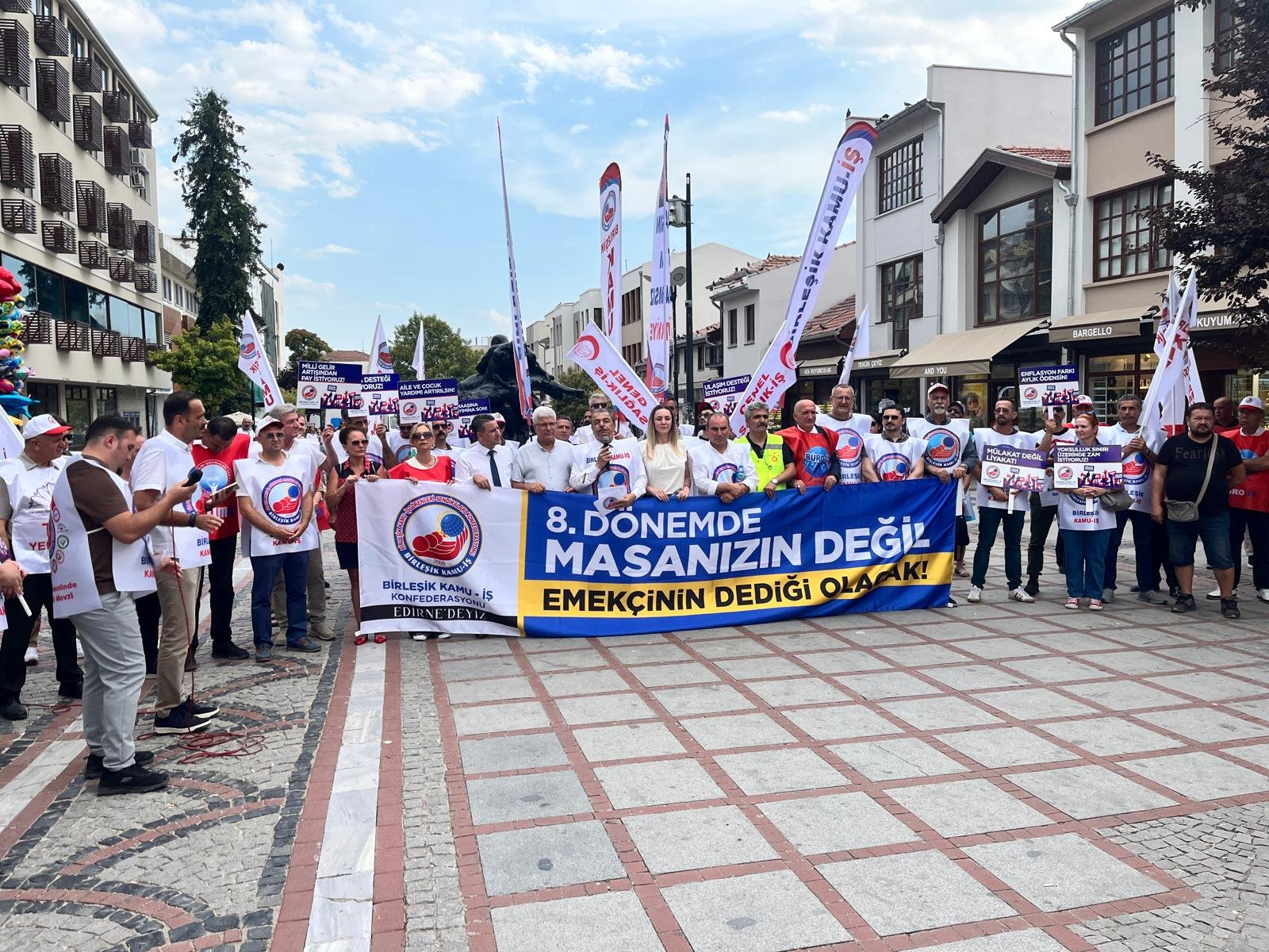 Birleşik Kamu-İş tarafından Saraçlar Caddesi’nde düzenlenen basın açıklamasına konfederasyonun genel başkanı Orhan Yıldırım’ın yanı sıra, Konfederasyon MYK Üyesi Mehmet Koç, Eğitim-İş Edirne Şube Başkanı Nedim Zobar, CHP Edirne İl Başkanı Harika Taybıllı, Zafer Partisi Edirne İl Başkanı Serkan Konak, CHP Edirne Merkez İlçe Başkanı Yücel Balkanlı, İYİ Parti Edirne İl Yönetim Kurulu Üyeleri ile konfederasyona bağlı sendikaların üyeleri katıldı.