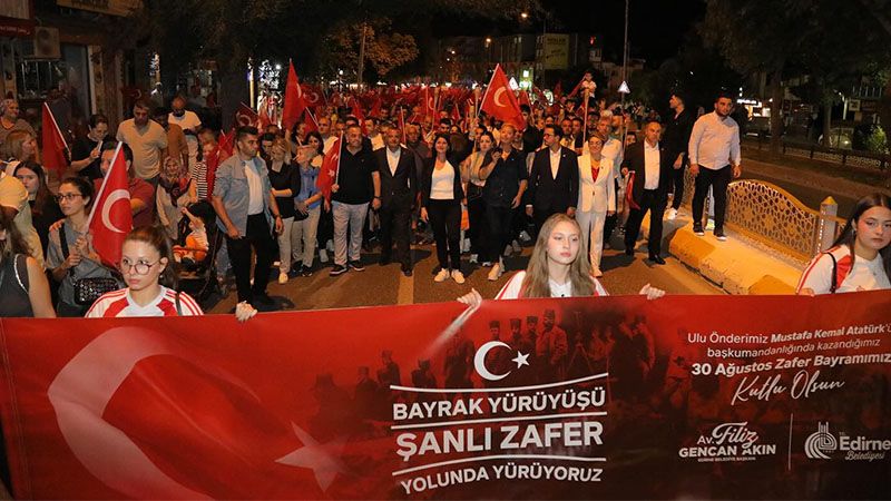 Edirne’de 30 Ağustos Zafer Bayramı, Edirne Belediyesi tarafından organize edilen coşkulu bir yürüyüşle kutlandı. Edirne Belediye Başkanı Av. Filiz Gencan Akın, tüm Edirnelilerin bağımsızlığa ve demokrasiye sahip çıkacağını vurgulayarak, “Bizim yolumuz Cumhuriyet’in yolu, bizim yolumuz Atatürk’ün yolu. Ne Mutlu Türk’üm diyene” dedi.