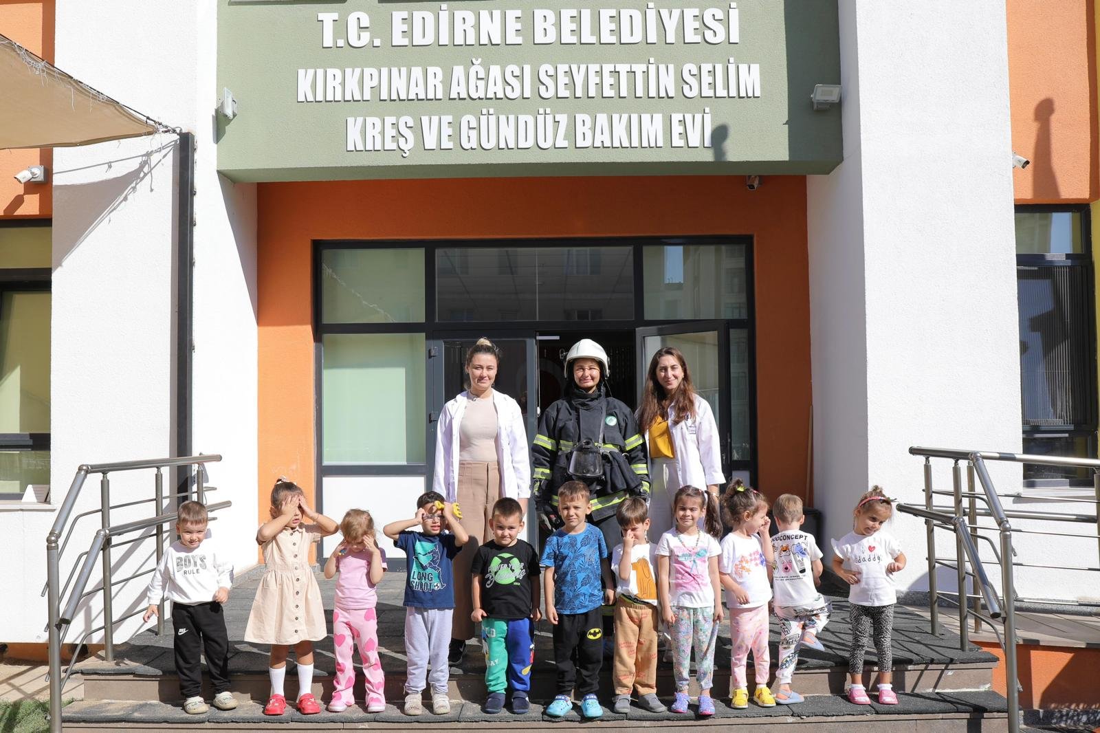 25 Eylül- 1 Ekim arasında kutlanan İtfaiye Haftası dolayısıyla, Edirne Belediyesi’nde görevli itfaiye erleri, Kırkpınar Ağası Seyfettin Selim Kreş ve Gündüz Bakım Evi öğrencileriyle buluştu. Minik öğrenciler, itfaiyecilere kendi elleriyle hazırladıkları resimleri hediye etti, itfaiyecilik mesleğine dair merak ettiklerini öğrenme fırsatı buldu.