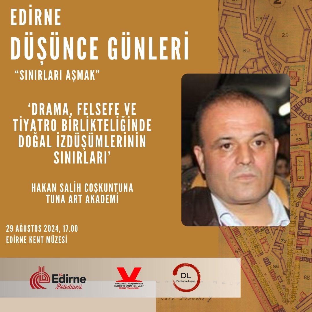 Tuna Art Akademi Kurucusu Hakan Salih Coşkuntuna, bugün saat 17.00’de Edirne Kent Müzesi’nde bir sunum yapacak. “Sınırları Aşmak” temalı Edirne Düşünce Günleri’nde, “Drama, Felsefe ve Tiyatro Birlikteliğinde Doğal İzdüşümlerinin Sınırları” konulu sunumla 26 Ağustos’ta başlayan etkinlik yarın sona erecek.