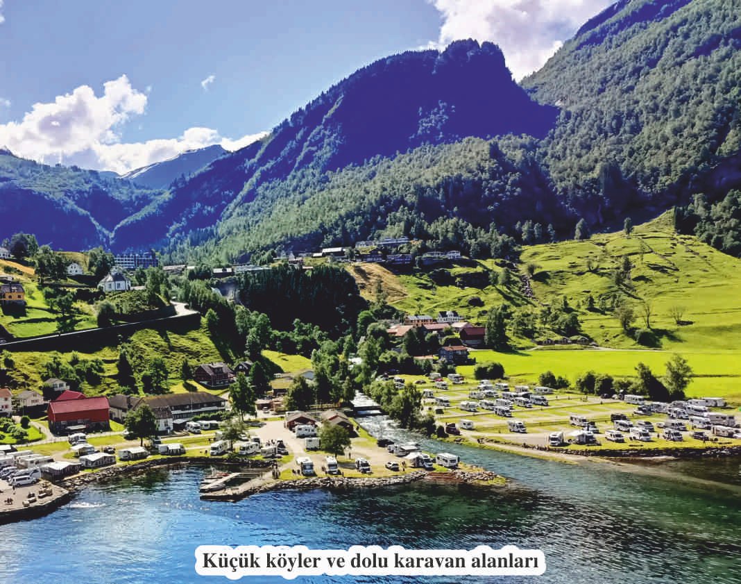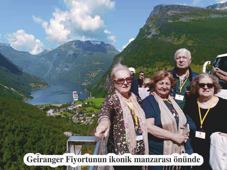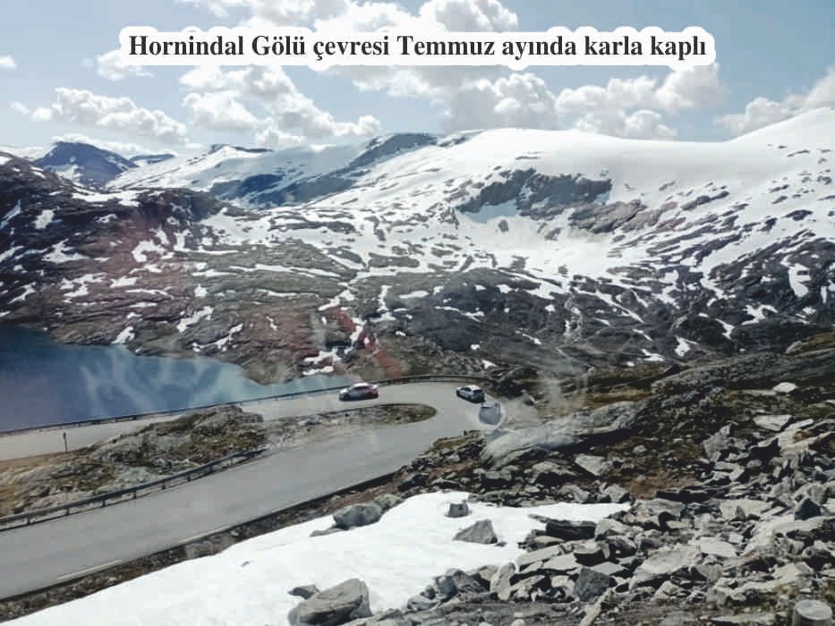 Hornindal Gölü’nü, otobüsle yanından geçerken görüyoruz. Tabanı 500 metre uzunluğu ile Avrupa’nın en derin gölü… Dağlara dağılmış rengarenk evleri, sakin, berrak bir gölü ve adını taşıyan bir nehri olan güzel bir kasaba olan Stryn’den geçiyoruz. Çok ilginç ve yükseklerinde hala karlar bulunan dağ silsileleri Geiranger fiyordunun başlangıcını oluşturuyor. Bu fiyordun son derecede etkileyici panoramik manzarasını izliyor, aşağıda oyuncak gibi duran devasa gemiyi görebiliyoruz. Bu güzel manzaraları arkamıza alarak fotoğraflar çekiyoruz. Bu ülkeye gelen her turistin bu güzelliği görmeden gitmediğini öğrenip onlara çok hak veriyoruz.