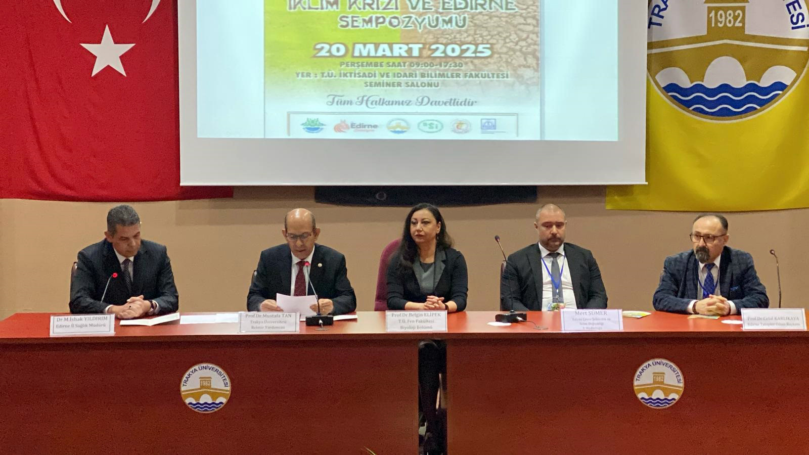 Konuşmaların ardından sempozyum Rektör Yardımcısı Prof. Dr. Mustafa Tan ve İl Sağlık Müdürü Dr. İshak Yıldırım’ın başkanlık ettiği ilk oturumla başladı. Oturumda, T.Ü. Fen Fakültesi Biyoloji Bölümü’nden Prof. Dr. Belgin Elipek tarafından ‘Küresel İklim Değişikliği ve Edirne’, Çevre Şehircilik ve İklim Değişikliği İl Müdürlüğü’nden Mert Sümer’in ‘İklim Değişikliği Sonucu Çevresel Sorunların Edirne İlindeki Yansımaları’ ve Edirne Tabip Odası Başkanı Prof. Dr. Celal Karlıkaya’nın ‘Yerküremiz İklimimiz Değişirken Ayakta Kalabilmek İçin Başka Bir Sağlık Yönetimi Gerekiyor Mu?’ konularındaki sunumları gerçekleştirildi.