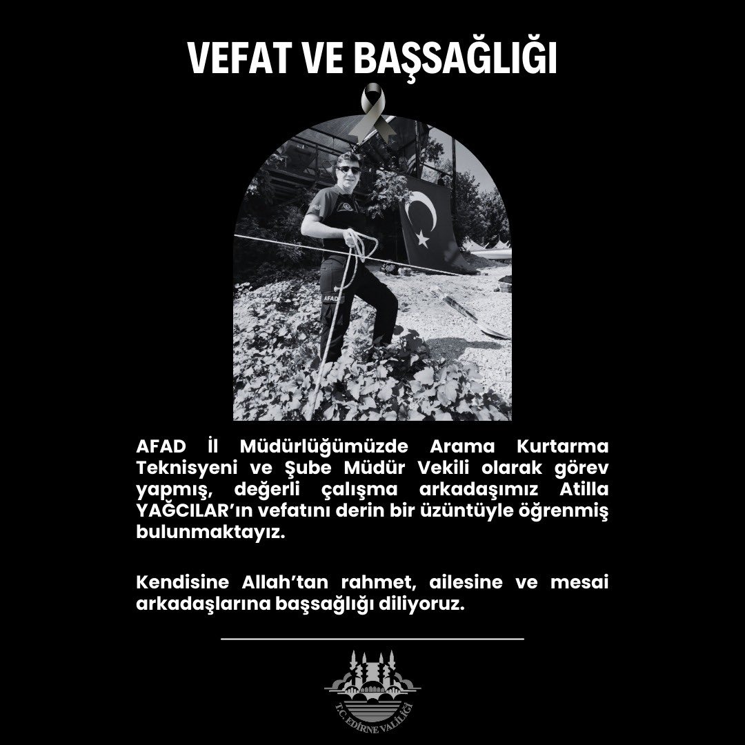Edirne AFAD İl Müdürlüğü’nde görevli arama kurtarma teknisyeni ve Şube Müdür Vekili Atilla Yağcılar, uzun süredir tedavi gördüğü hastalıktan kurtulamayarak, hayatını kaybetti.