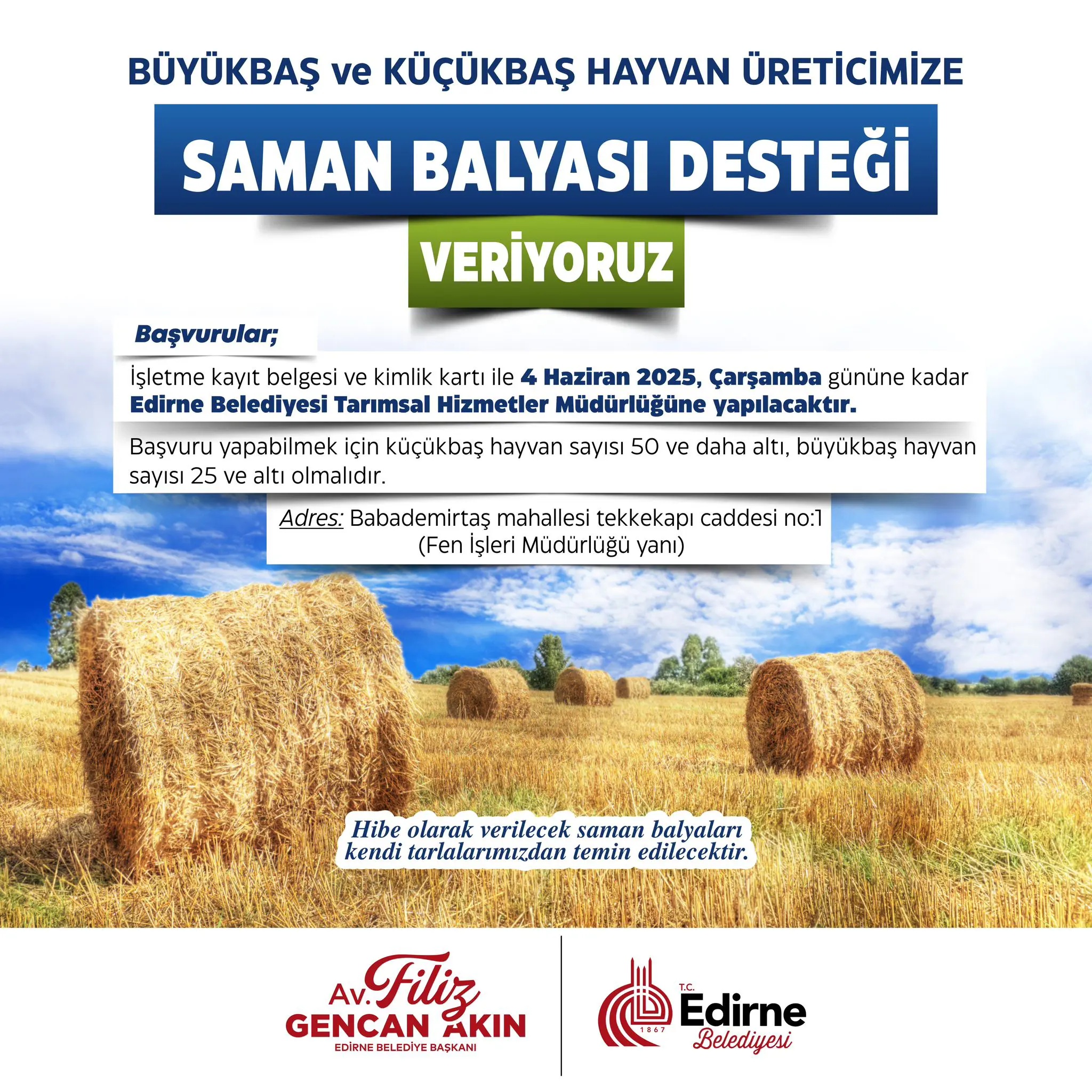 Edirne Belediyesi büyükbaş ve küçükbaş hayvan üretimi yapan küçük ölçekli çiftçilere, saman balyası hibe desteği verecek.
