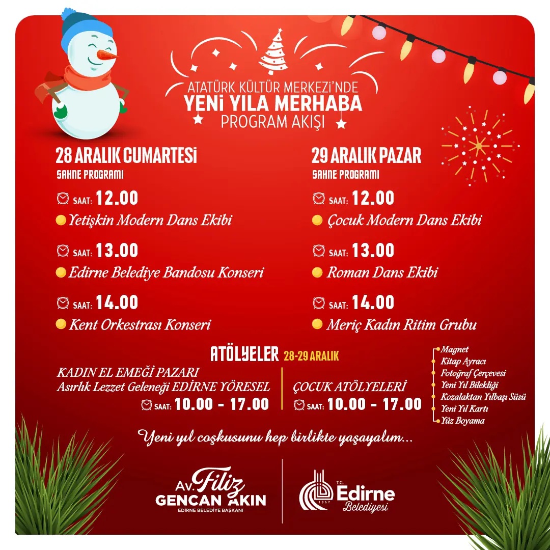 Edirne Belediye Başkanı Av. Filiz Gencan Akın, tüm Edirne halkını etkinliklere davet ederek “2025 yılına hep birlikte coşkuyla “merhaba” demek için sizleri, Edirne Belediyesi Atatürk Kültür Merkezi ve Belediye Konservatuvarı’nda düzenleyeceğimiz “Yeni Yıla Merhaba” etkinliklerimize davet ediyorum. Hafta sonu boyunca sürecek programlarımızda sahne performanslarından çocuk atölyelerine, Kadın El Emeği Pazarı’ndan müzik ve dans gösterilerine kadar her yaştan hemşehrilerimizin keyif alacağı birçok etkinlik sizleri bekliyor. Yeni yılın umut ve mutluluğunu hep birlikte paylaşalım.” ifadelerini kullandı.