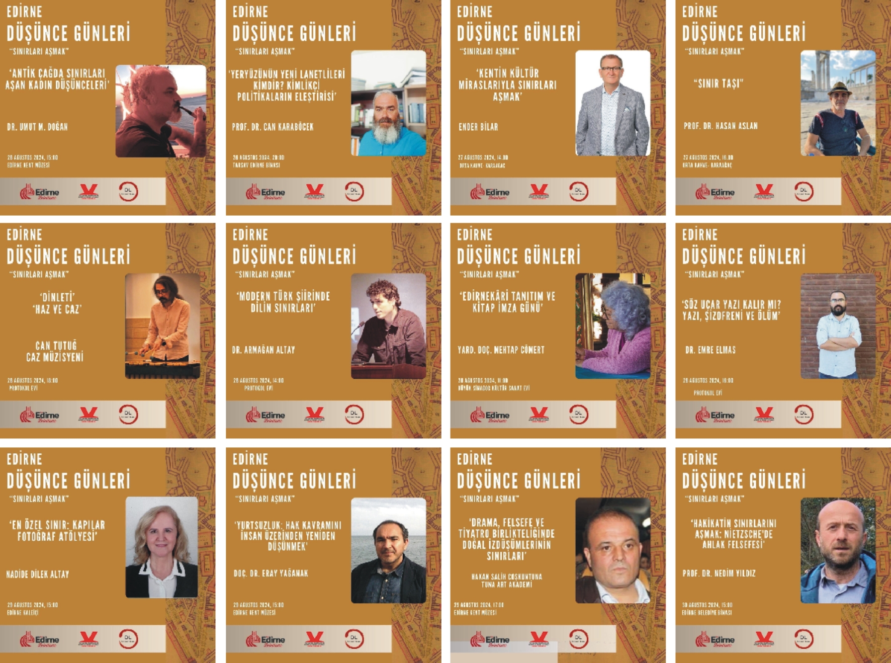 30 Ağustos Cuma, son gün etkinlikleri Edirne Belediyesi’nde gerçekleşecek. Saat 13.00-13.45 arası Doç. Dr. Elife Kılıç, ‘Felsefe ve Coğrafya Kesişiminde Mekansal Sınırlar’, saat 15.00-16.45 arası Prof. Dr. Nedim Yıldız, ‘Hakikatın Sınırlarını Aşmak Nietzsche’de Ahlak Felsefesi’ ile atölye çalışmaları sona erecek.