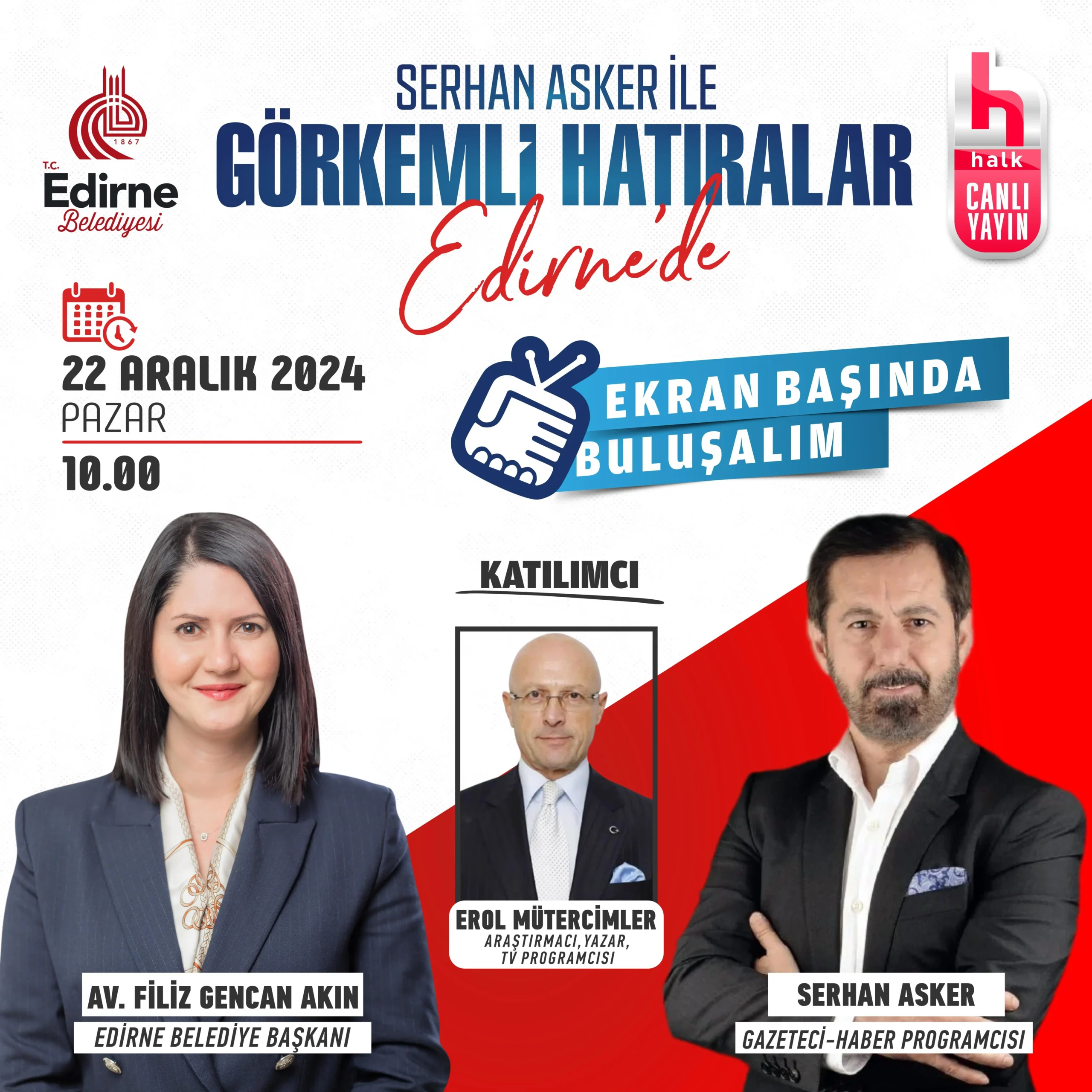 Edirne, ünlü gazeteci ve haber programcısı Serhan Asker’in sunduğu ve büyük bir izleyici kitlesine hitap eden “Görkemli Hatıralar” programına ev sahipliği yapmaya hazırlanıyor. Halk TV ekranlarında canlı yayınlanacak olan bu özel program, Edirne Belediyesi’nin organizasyonuyla 22 Aralık Pazar günü saat 10.00’da izleyiciyle buluşacak.