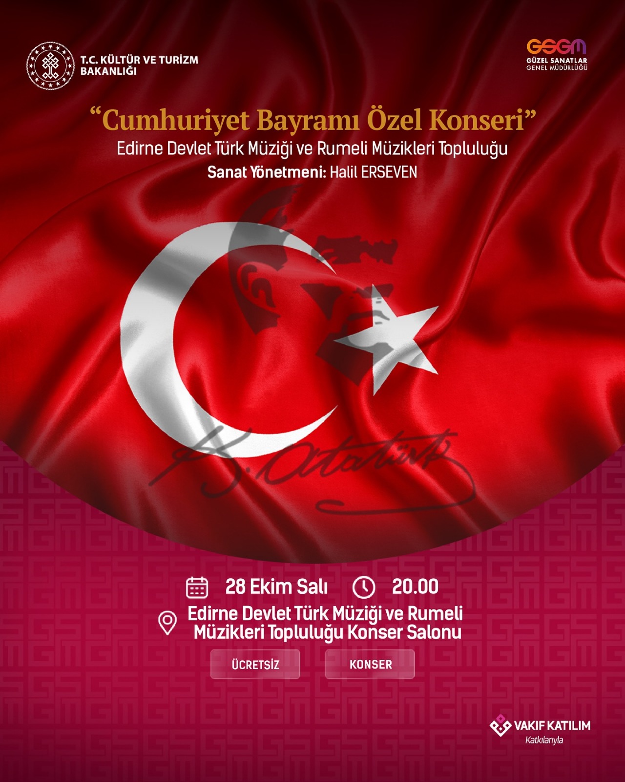 28 Ekim Salı günü akşamı saat 20.00’de başlayacak Halil Erseven yönetimindeki “Cumhuriyet Bayramı Özel Konser” Topluluk Konser Salonu’nda ücretsiz olarak izlenebilecek.
