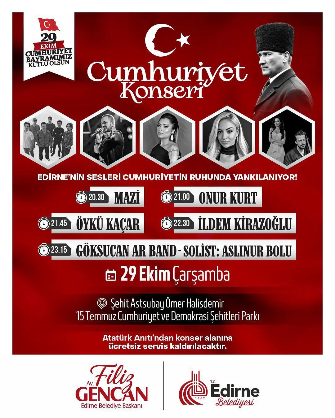 Edirne Belediyesi, vatandaşların etkinliğe kolaylıkla ulaşabilmesi için Atatürk Anıtı’ndan konser alanına ücretsiz servisler kaldırılacağını da duyurdu.