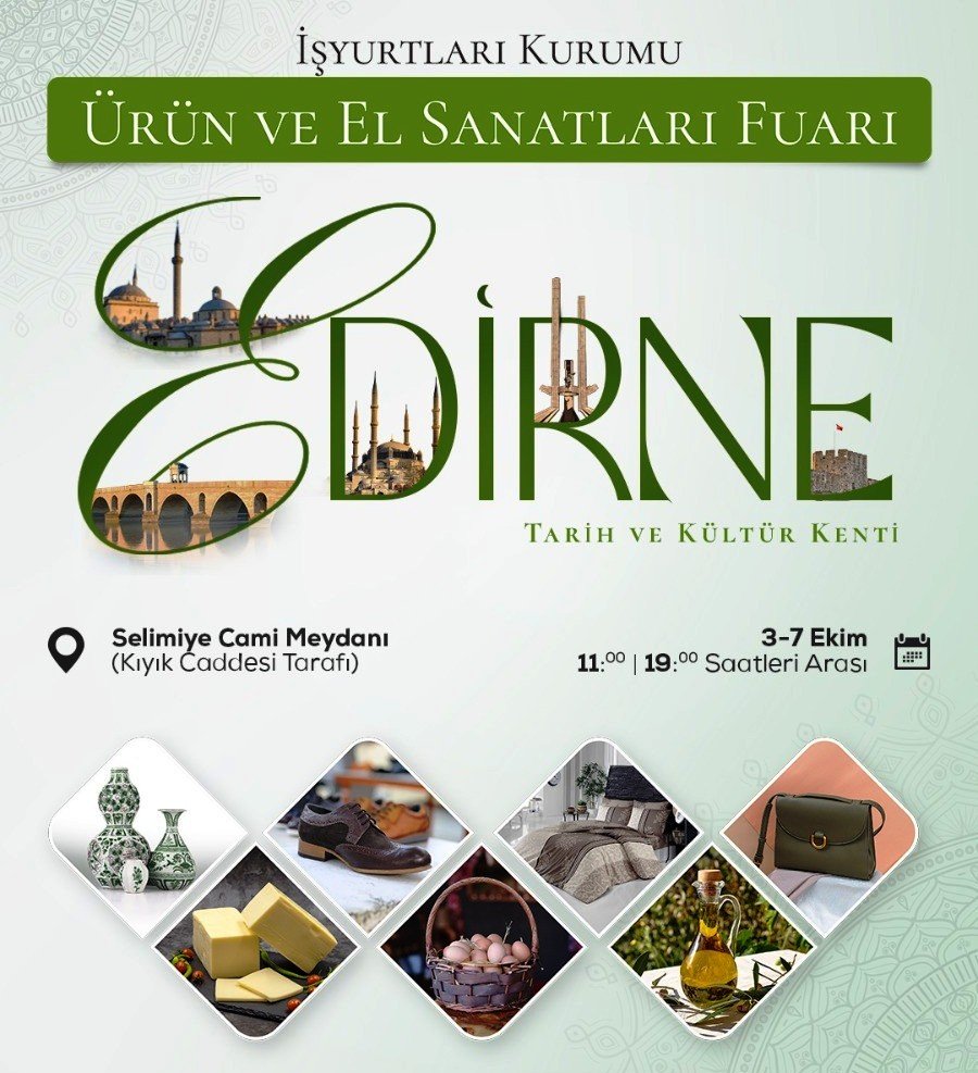 Bu kapsamda; 2025 yılının 4’üncü ‘İşyurtları Ürün ve El Sanatları Fuarı’nın 03-07 Ekim tarihleri arasında Edirne Merkez Meydan Mahallesinde bulunan Kıyık Caddesi ile Su Terazisi Sokak-Hatip Sokak arasında kalan (Selimiye Cami yanı) park alanında yapılarak, 5 gün boyunca ziyarete açık olması planlanmaktadır. Bahse konu fuarın stant kurulumu, işyurdu müdürlüklerinin gelişi ve yerleşimi, etkinlik, stantların sökümü ve tahliyesi olmak üzere 26 Eylül – 10 Ekim 2025 tarihleri arasında tamamlanması düşünülmektedir.