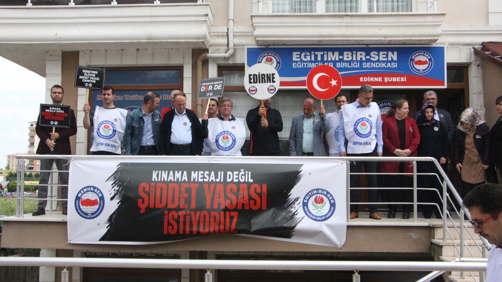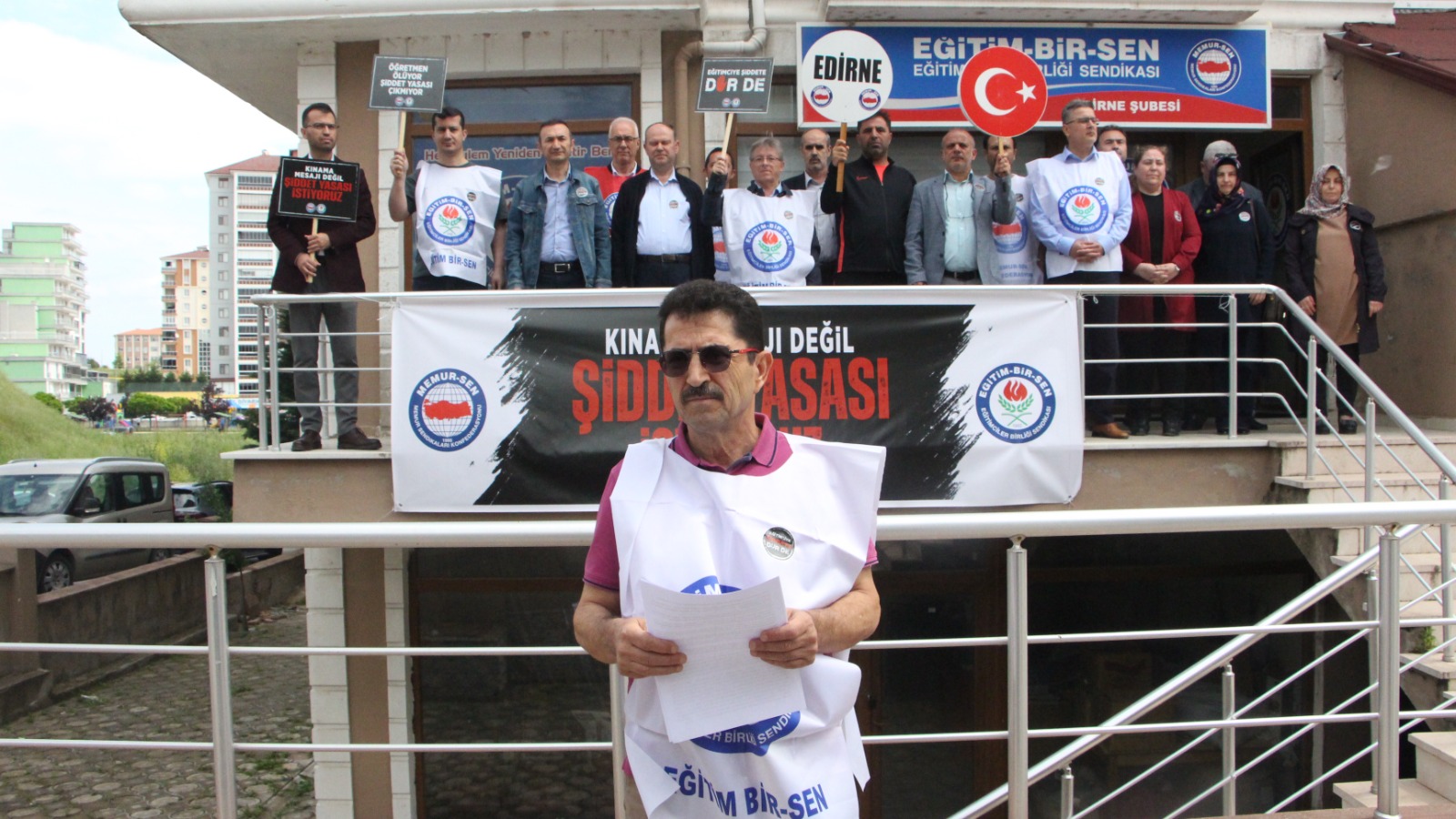 Eğitim Bir-Sen Edirne Şube Başkanı Erdinç Dalgıç ve sendika üyeleri, kentteki sendika binası önünde İstanbul Eyüpsultan’da Irak asıllı Y.K.’nin okuldan atılmasından sorumlu tuttuğu okul müdürü İbrahim Oktugan’ı öldürmesi olayıyla ilgili basın açıklaması gerçekleştirdi. 81 ilde eş zamanlı düzenlenen açıklamayı okuyan Şube Başkanı Dalgıç, eğitim çalışanları olarak şiddete karşı yasal düzenleme istediklerini söyledi.