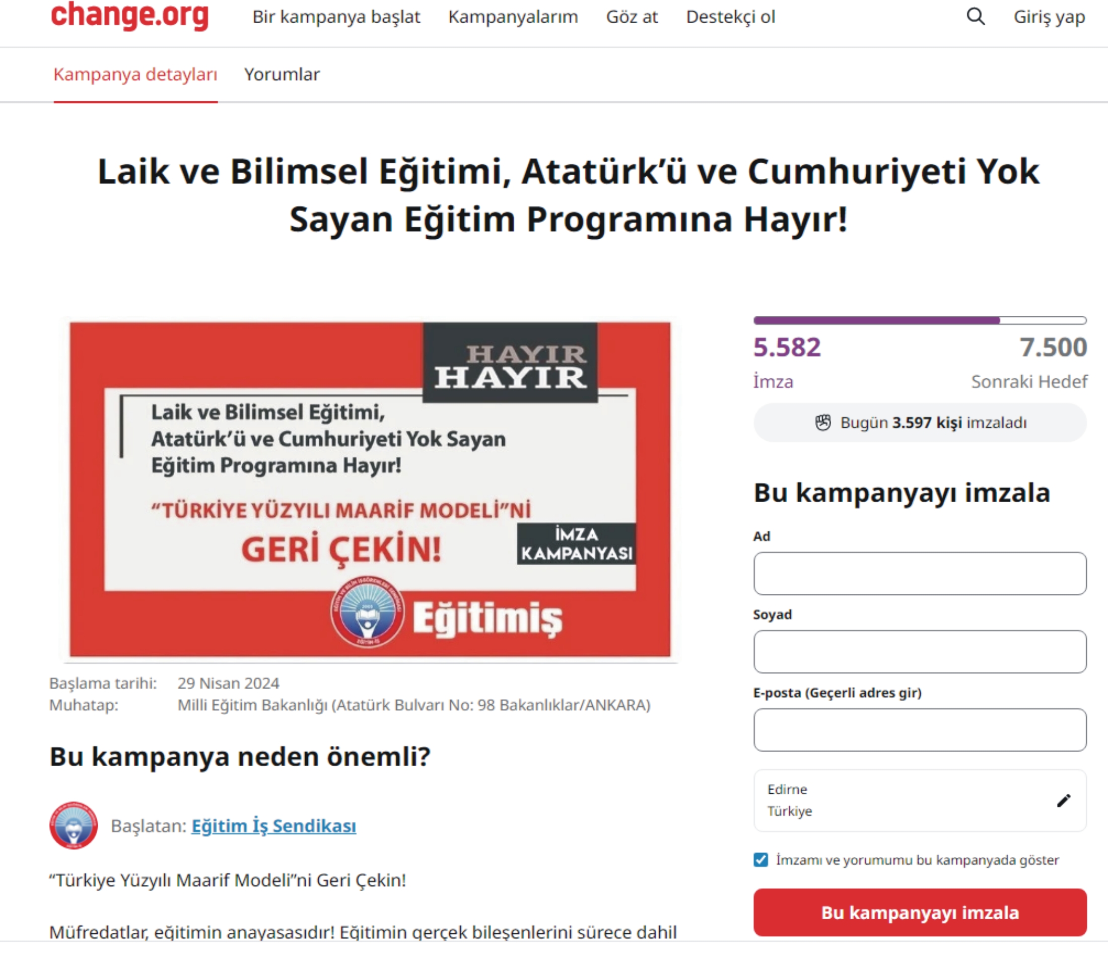 Kampanyaya https://www.change.org/p/laik-ve-bilimsel-e%C4%9Fitimi-atat%C3%BCrk-%C3%BC-ve-cumhuriyeti-yok-sayan-e%C4%9Fitim-program%C4%B1na-hay%C4%B1r?utm_medium=custom_url&utm_source=share_petition&recruited_by_id=2fd60324-2640-41ba-85c2-38a2ddaad467 adresinden katılanabiliniyor.