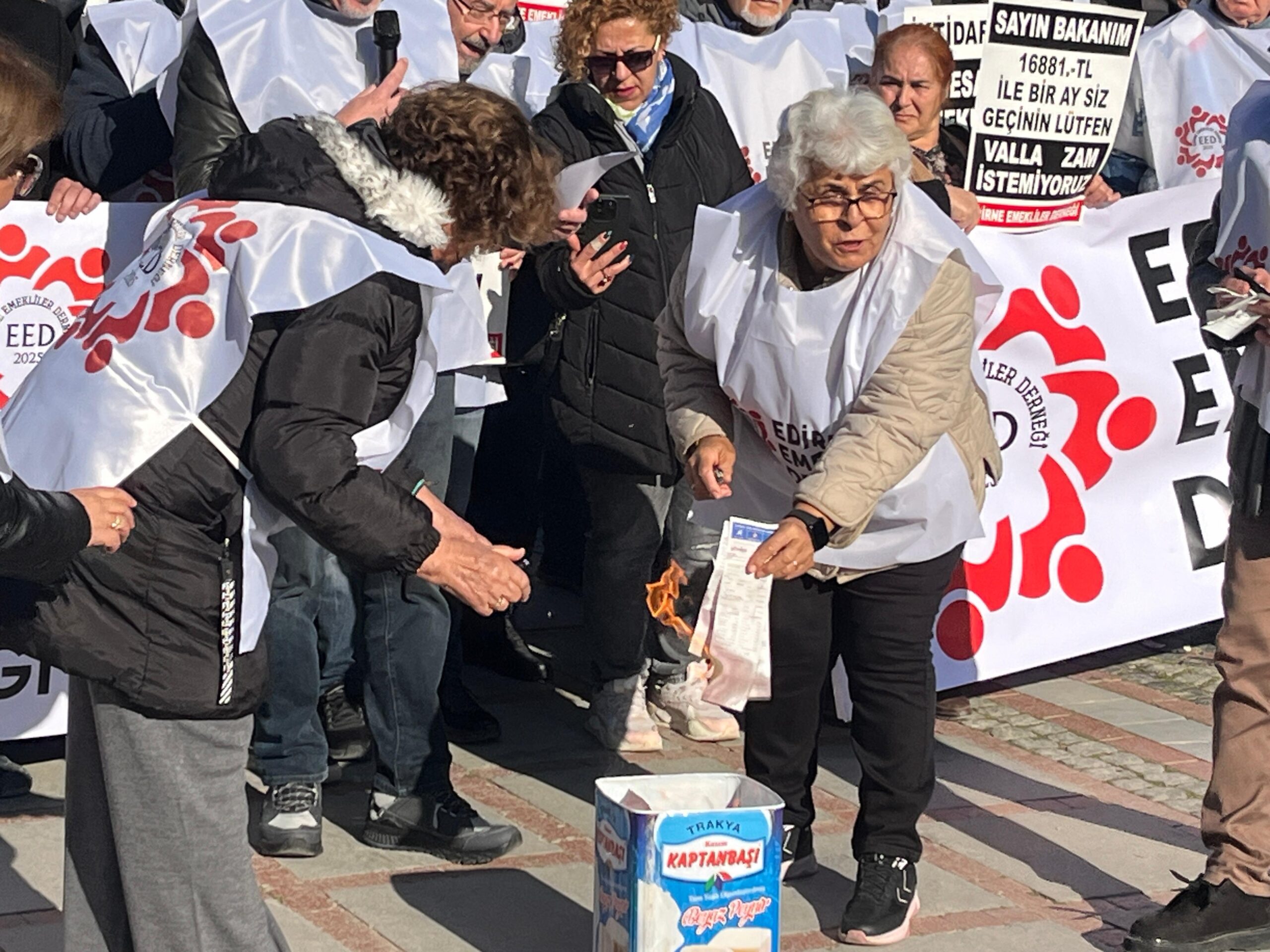 Türkiye Büyük Millet Meclisi’nde (TBMM) 2026 bütçesi görüşülmeye devam ederken, TÜİK’in açıklayacağı Aralık enflasyonuyla beraber milyonlarca emeklinin de maaşlarına yansıyacak zam Ocak ayında belli olacak. Ülke genelinde 16 bin 881 TL ile en düşük maaşı alan kesim olan emekliler, 2026 yılında da açlık sınırının çok altında yaşamamak için Edirne’de bir araya gelerek, adil ücret taleplerini haykırdı. Edirne Emekliler Derneği tarafından Saraçlar Caddesi’nde gerçekleştirilen etkinlikle basın açıklaması gerçekleştirildi. Açıklamaya katılan emekliler, hayat pahalılığı nedeniyle ödeyemediklerini belirttikleri faturaları yaktı. Siyasi parti ve sivil toplum kuruluşu temsilcilerinin de destek verdiği açıklamayı, dernek başkanı Ahmet Ziya Yaz okudu.