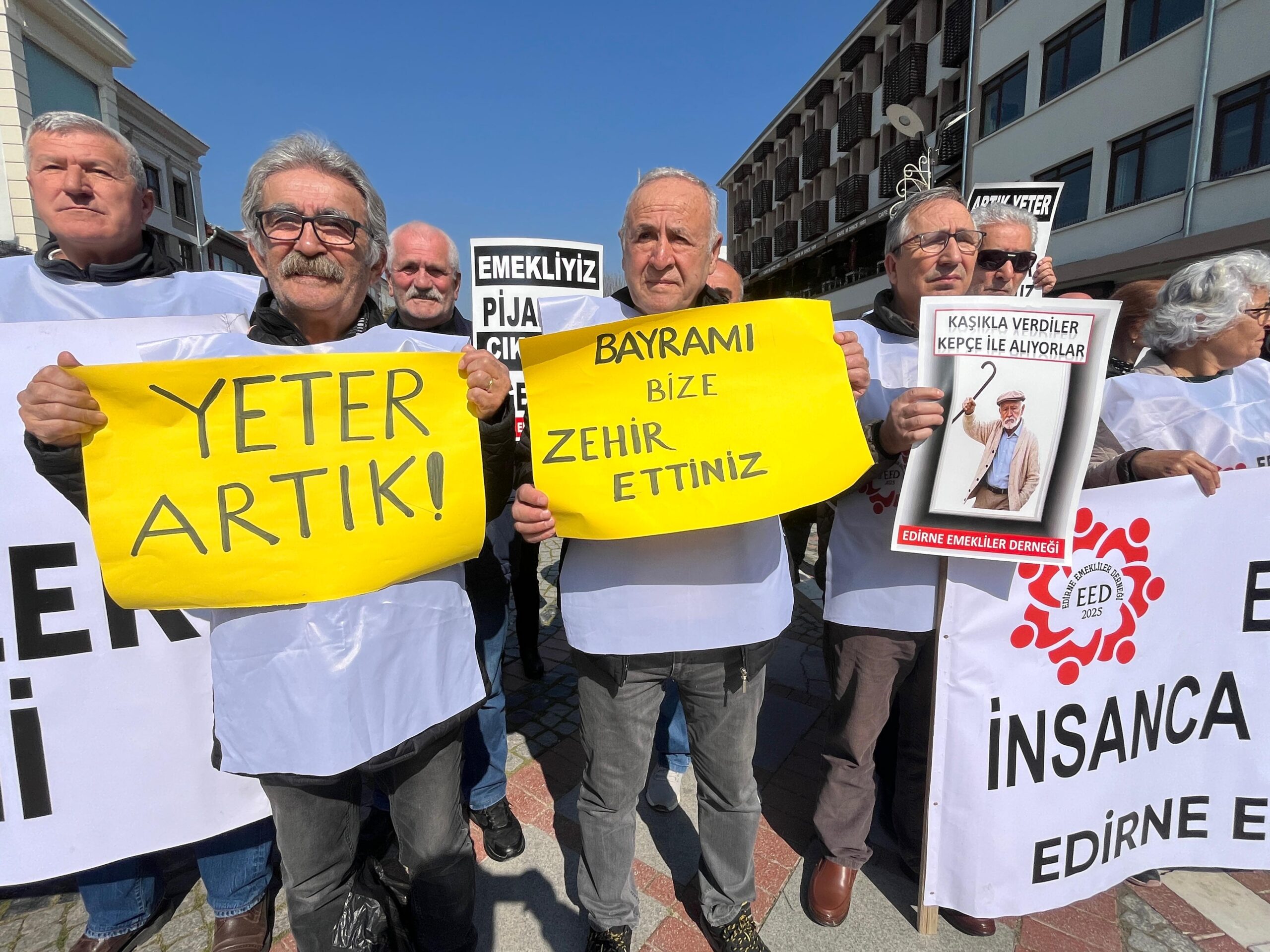 Edirne’de emekliler, bu yıl bayram ikramiyesinde değişiklik yapılmamasına tepki amaçlı alanlara çıkarak ses yükseltti.