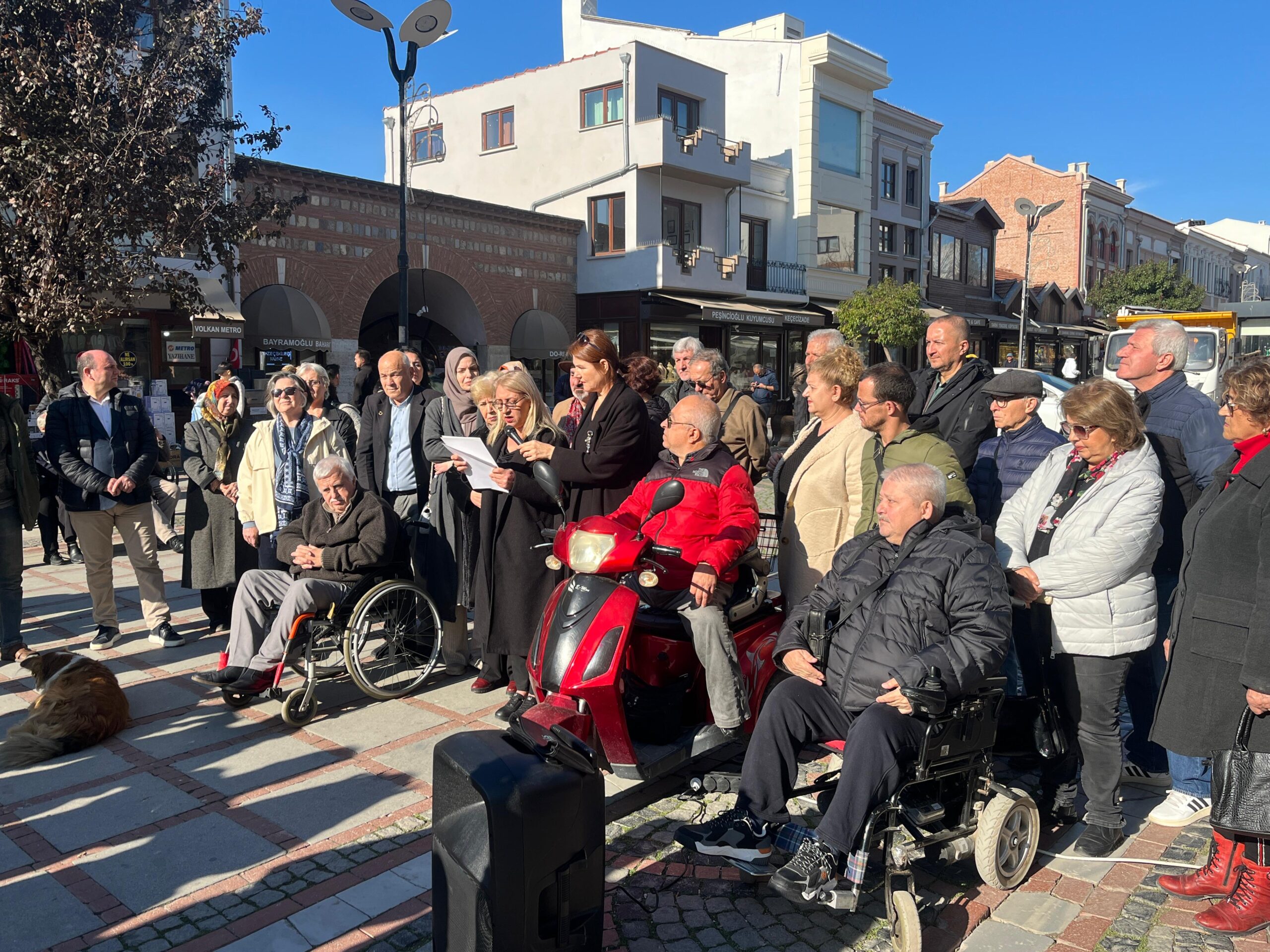 EKK Engelliler Meclisi’nin Saraçlar Caddesi’nde gerçekleştirdiği basın açıklamasına çok sayıda engelli vatandaş ve yakını katıldı. Çeşitli sivil toplum kuruluşu temsilcilerinin de destek verdiği açıklamayı, Nevreste Deniz Yılmaz yaptı. Açıklamada engelli sorunları dile getirilip, kazanılmış haklar hatırlatılırken, eşit yurttaşlık talepleri yinelendi.