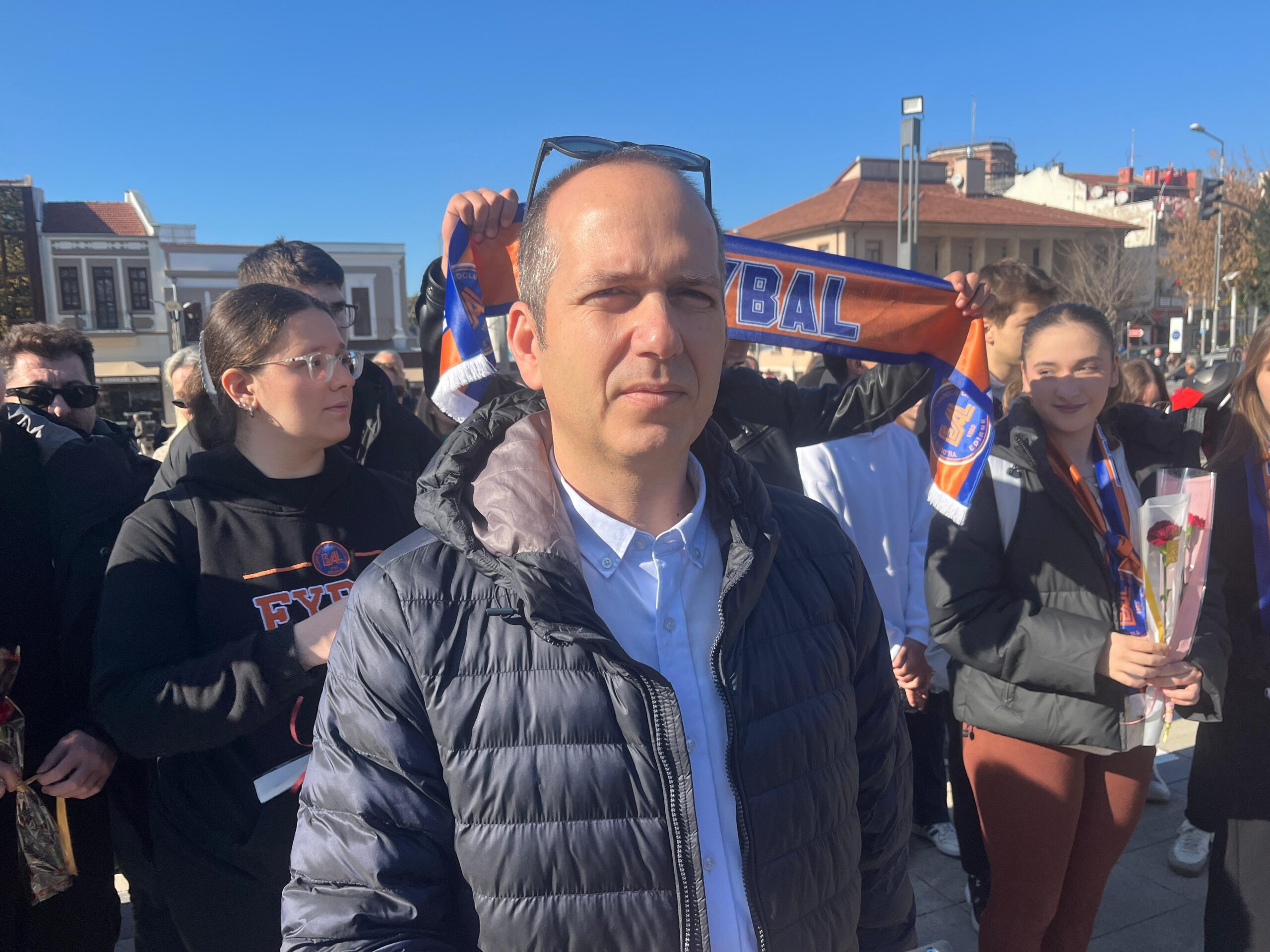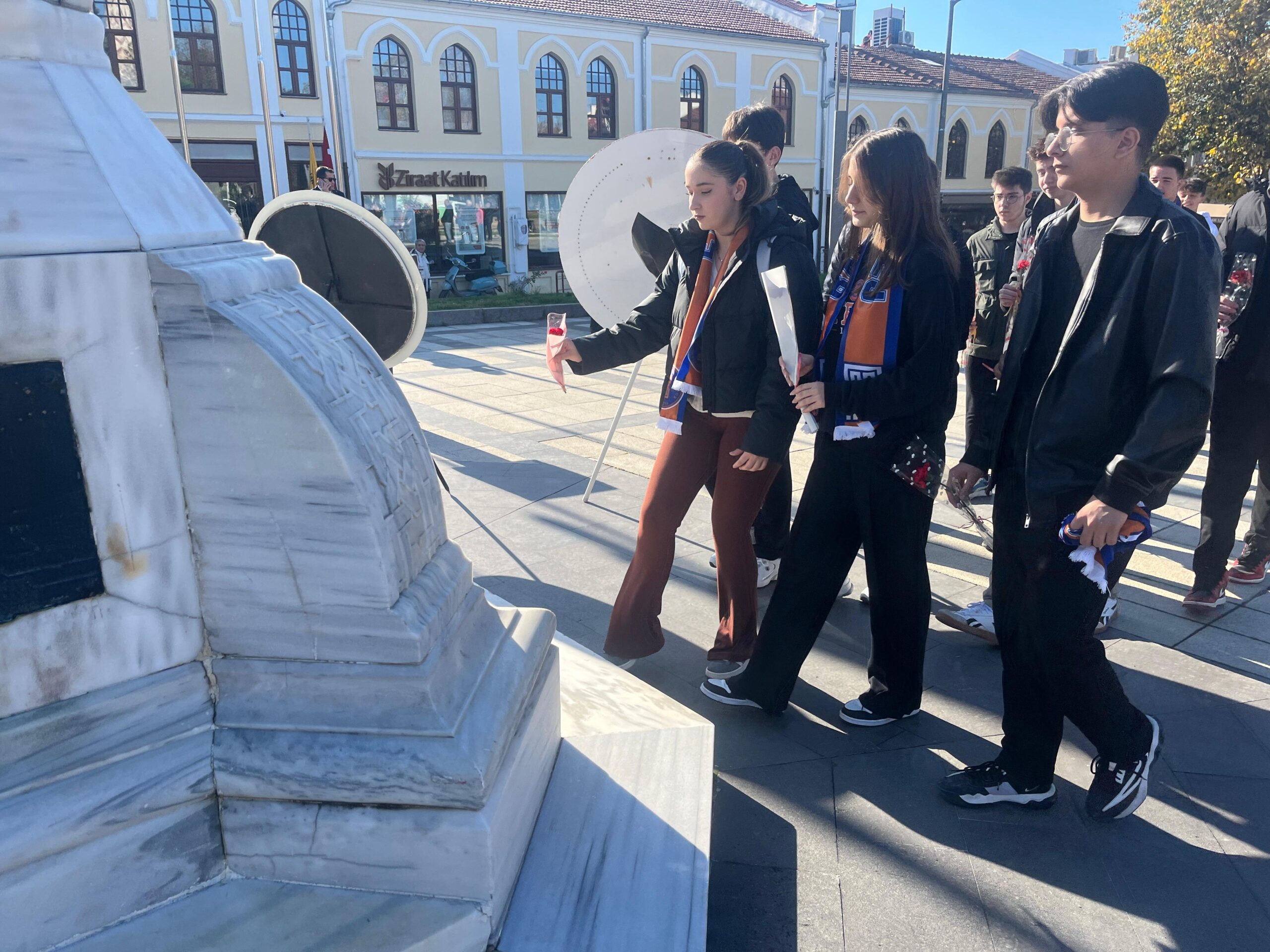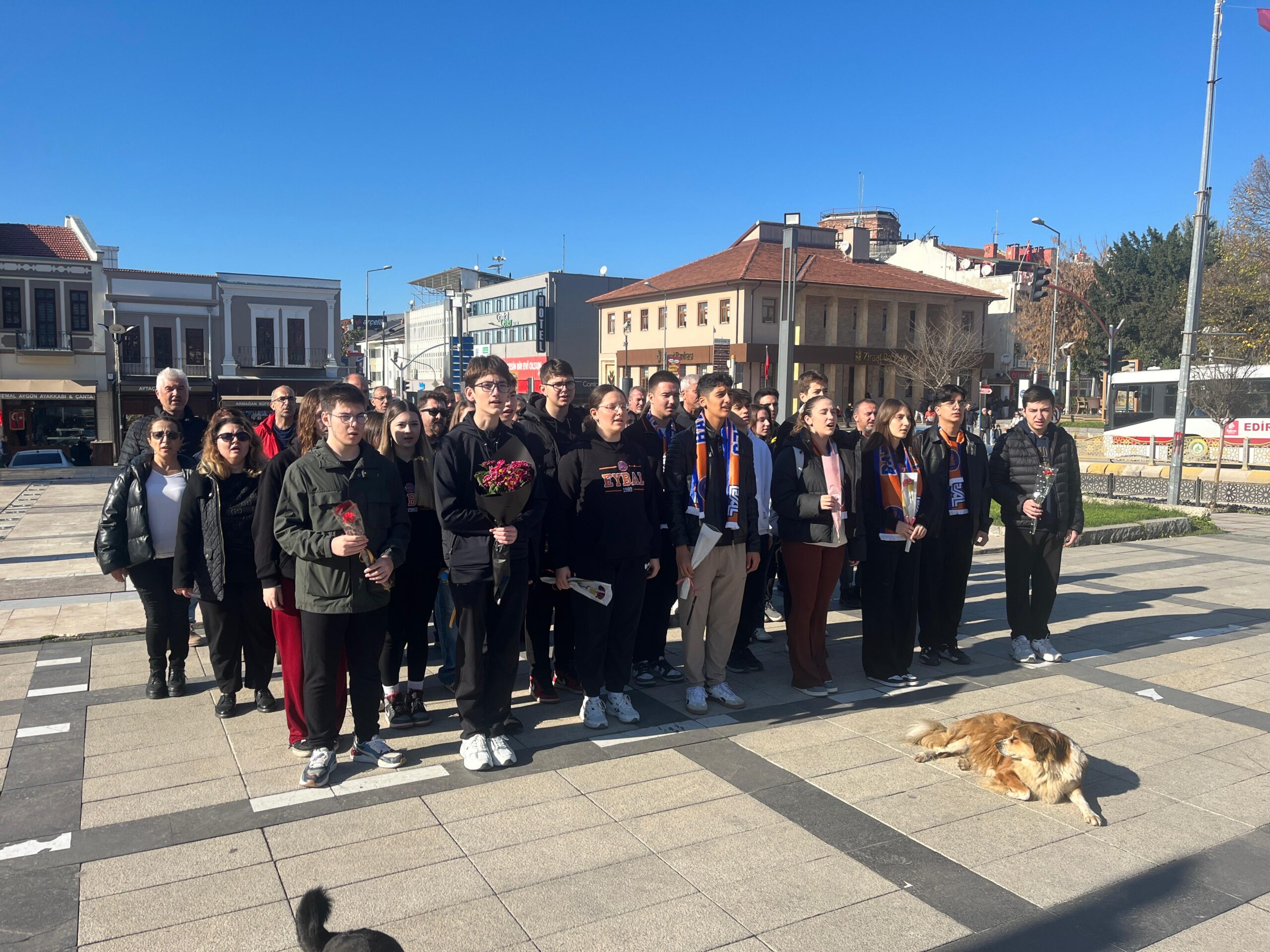 Edirne’de, binaları depreme dayanıksız olduğu gerekçesiyle geçici olarak taşındıkları 1’inci Murat Anadolu Lisesi’nin fiziki koşullarının yetersiz olduğunu savunan Edirne Yıldırım Beyazıt Anadolu Lisesi (EYBAL) öğrenci ve velileri, 24 Kasım Öğretmenler Günü’nü Atatürk Anıtı’nda kutladı.