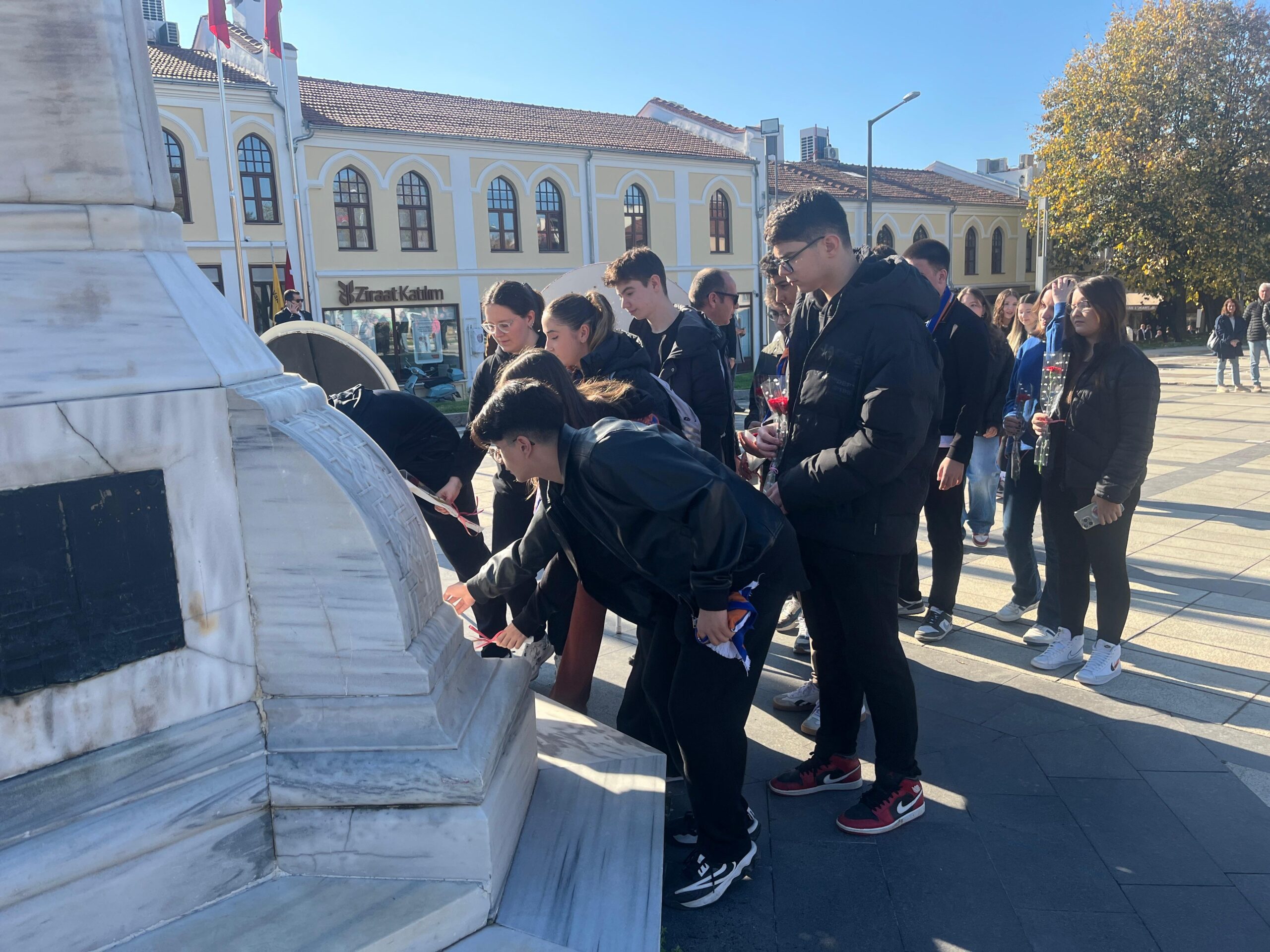 Öğrenciler, başöğretmen Gazi Mustafa Kemal Atatürk’ün anıtına çiçek bırakırken, veliler adına Bahattin Özkan açıklama yaptı.