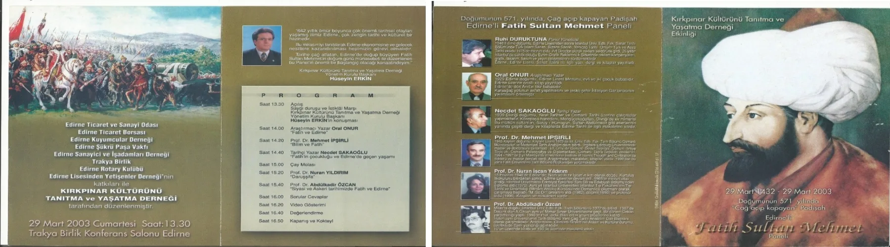 Edirne ve ülkemiz için çok önemli olan Fatih Sultan Mehmed’in Edirne ile özdeşleşmesi için Kırkpınar Kültürünü Tanıtma ve Yaşatma Derneği başkanlığını yaptığım yıllarda 2003-2006 yıllarında 5 yıl boyunca Fatihin doğum günü münasebetiyle 30 Mart tarihinde Fatihin tanıtımı için ”Edirneli Fatih Sultan Mehmet” panelleri yaptık.