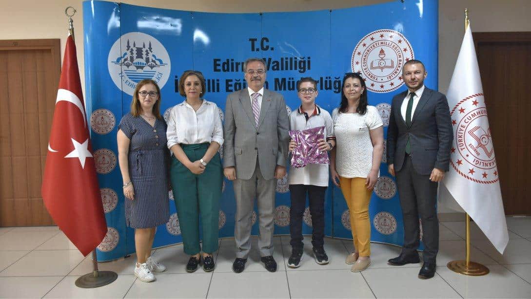 Ortaokul kategorisinde Türkiye üçüncüsü olan Uzunköprü Yunus Emre Ortaokulu öğrencisi Furkan Mert Meriç’e ödülü öğretmenleri eşliğinde geldiği İl Milli Eğitim Müdürlüğü’nde İl Millî Eğitim Müdürü Dr. Önder Arpacı tarafından verildi.