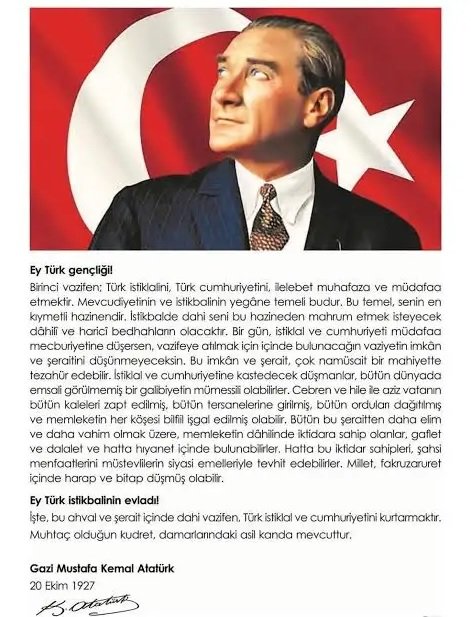 Tüm Öğretmenler Sendikası (TÖS) Edirne İl Yönetim Kurulu olarak 98 yıl önce bize bu günleri anlatan ve bize ışık tutan Atatürk’ün Büyük ‘Söylev’inin Ulusumuza kutlu olmasını diliyoruz.