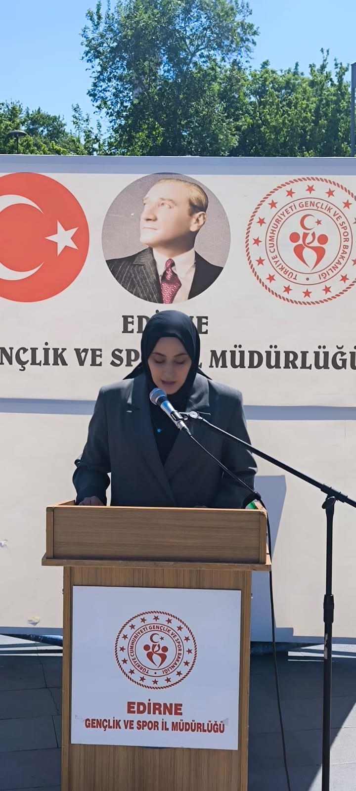 Edirne Gençlik ve Spor İl Müdürü Selim Ak’ın anıta çelenk sunumunun ardından gençler adına Şükran Sinici tarafından konuşma yapıldı. Sinici, gençliğin bir milletin en büyük hazinesi olduğunu söyledi.