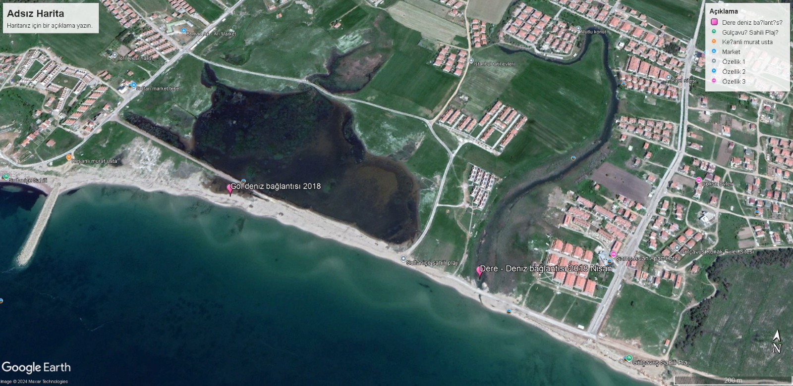 “Uydu görüntülerinde de mevcut. 2003 uydu görüntüsünde sahildeki küçük göl alanı ve derenin konumu ve kumsal görünüyor. Balıkçı barınağının tamamlanmasından sonra sahilin stabil yapısı bozularak kumsal alan azalmaya başlamış ve kıyıdaki sezonluk yolda mevsim dışında kullanılamaz duruma gelince sahil yolu bozulmasına karşın taşlı tahkimat önlemi alınarak kumsal taşlanmış. 2016 2018 – 2023 uydu görüntülerinden sahil konumu görünmektedir. Yaz sezonu dışında deniz kendi hareketleriyle sahil düzenlemesi ve göl konumunu düzenlemektedir. Keza derenin deniz ağzına köprü yerine, yaz aylarında kullanımı daha uygun olan ‘kasis’ yapılabilirdi. Köprü mansabı deniz kumuyla kapatılabileceği için yaz aylarında dere akışı yavaşlayacağından koku ve sinek oluşumuna da imkan verecektir.