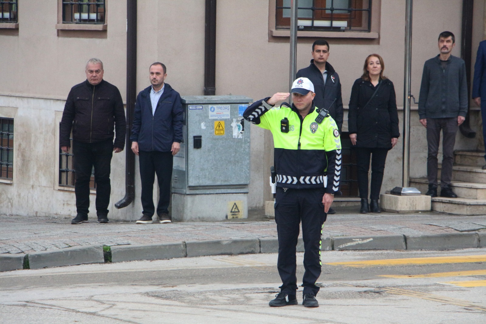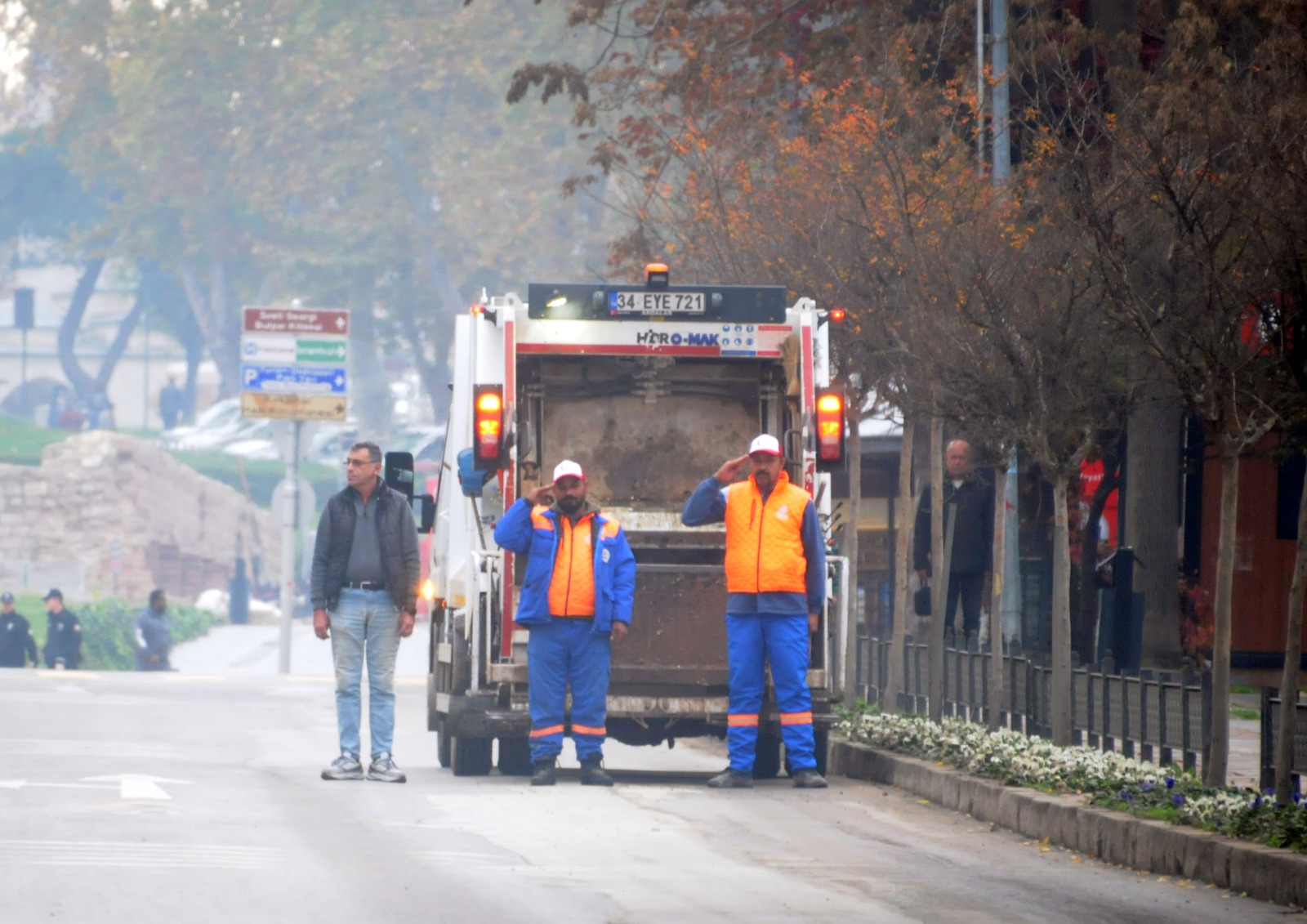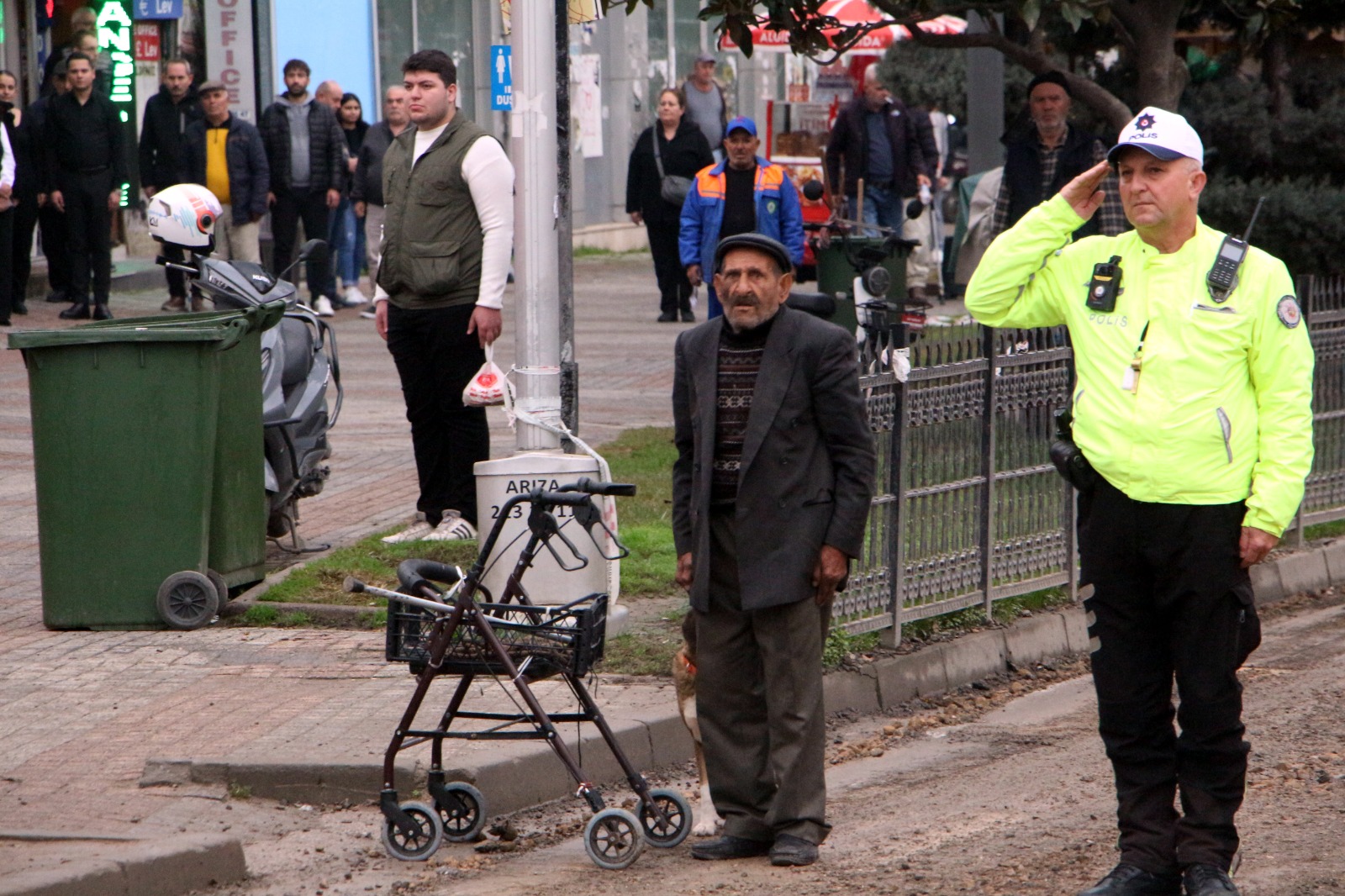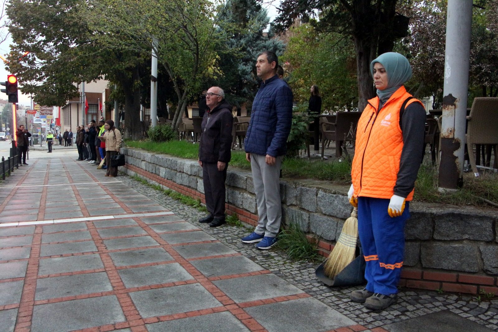 Sirenler çalarken, kentte adeta hayat durdu. İş yerlerinde çalışanlar dışarı çıktı, trafik kontak kapatan sürücüler de saygı duruşuna geçti.