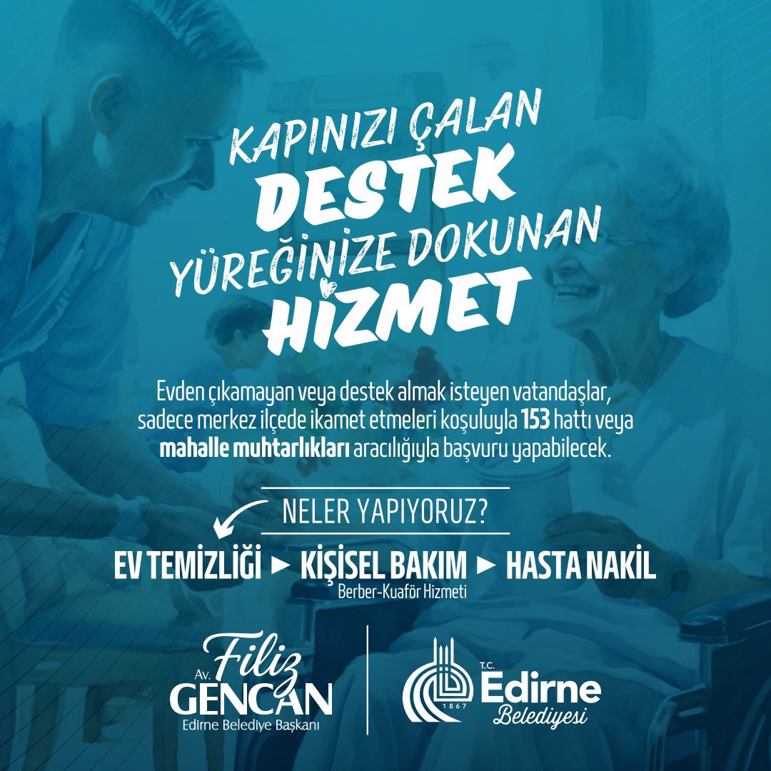Edirne Belediye Meclisi’nde alınan karar doğrultusunda, özel olarak oluşturulan ekipler yaşlı, engelli ve kronik hastalığı sebebiyle dışarıya çıkamayan ihtiyaç sahiplerinin evlerine giderek hem ev temizliği yapacak hem de berberlik gibi kişisel bakım hizmetleri sunacak…