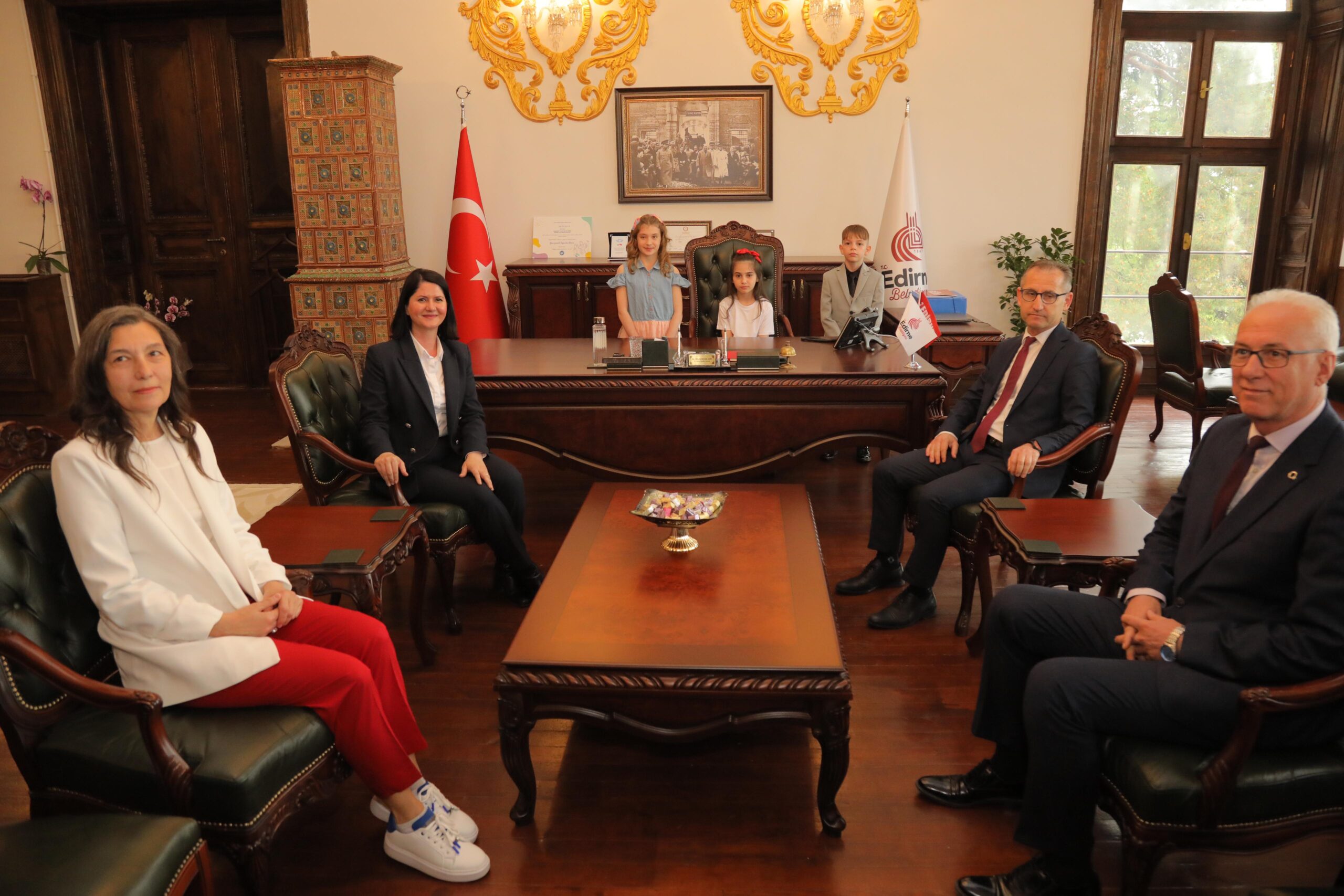 Edirne Belediye Başkanı Av. Filiz Gencan Akın, 23 Nisan Ulusal Egemenlik ve Çocuk Bayramı nedeniyle kendisini ziyarette gelen İl Milli Eğitim Şube Müdürü Ercan Aras, 50. Yıl İlkokulu Müdürü Arif Bekler, Sınıf Öğretmeni Özlem Kavas ile 50. Yıl İlkokulu öğrencileri Defne Ataçay, Asrın Tekin ve Mina Koşar’ı kapıda karşıladı. Belediye Başkanı Av. Filiz Gencan Akın, kendisini ziyarete gelen öğrencileri, kucaklayarak 23 Nisan Ulusal Egemenlik ve Çocuk Bayramını kutladı.