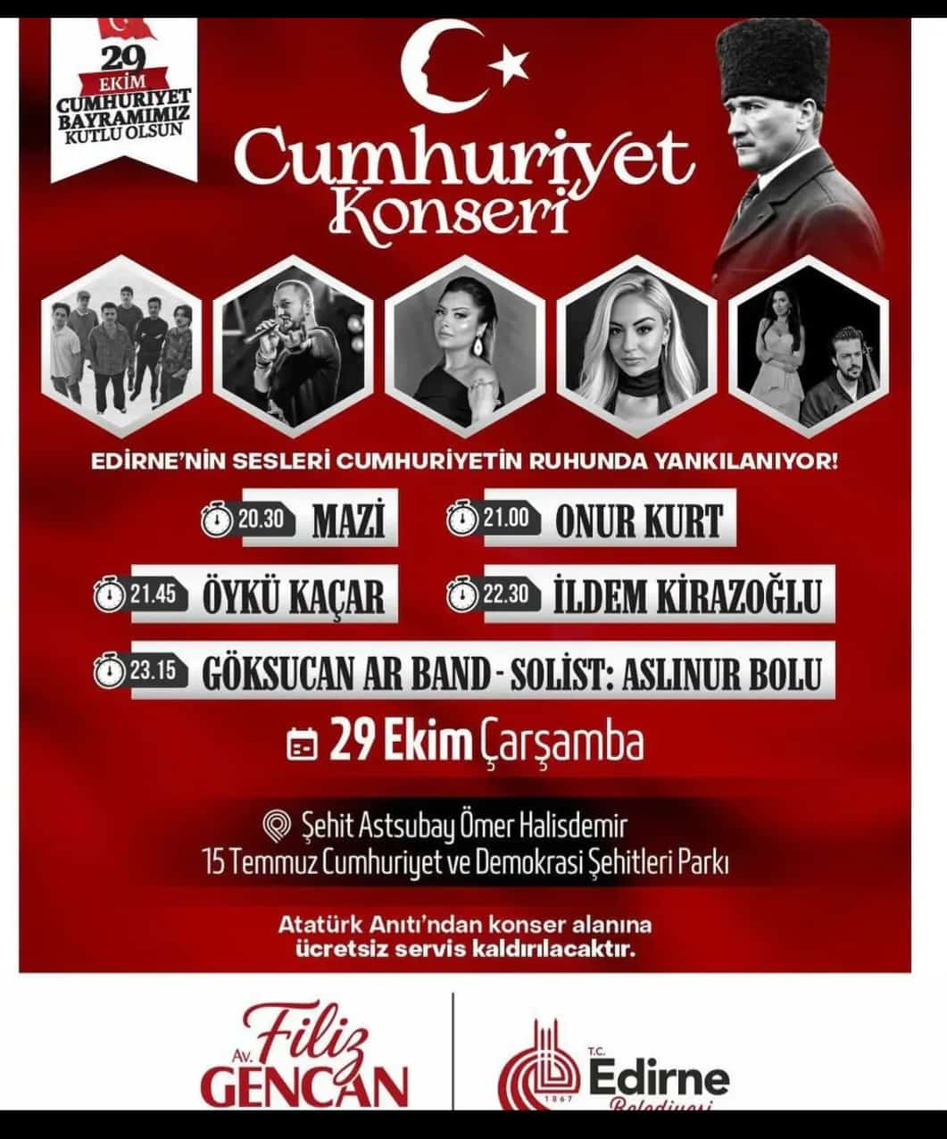 Edirne Belediyesi’nin geleneksel Fener Alayı 29 Ekim Çarşamba günü saat 20.00’de Şükrüpaşa İlkokulu önünden başlayacak, Cumhuriyet Konseri saat 20.30’da Şehit Astsubay Ömer Halisdemir 15 Temmuz Cumhuriyet ve Demokrasi Şehitleri Parkı’nda gerçekleştirilecek…