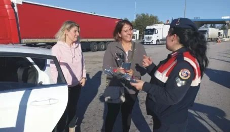 Edirne’de jandarma ekiplerince 25 Kasım Kadına Yönelik Şiddetle Mücadele Günü dolayısıyla Edirne TEM otoyolu gişelerinde kadınlara yönelik farkındalığı artırmak amacıyla karanfil ve broşür dağıtılarak KADES Uygulaması tanıtımı gerçekleştirildi.
