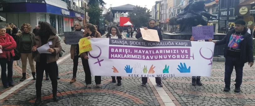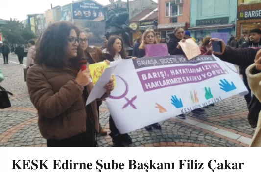 Edirne Kadın Platformu’nu oluşturan kadınlar, 25 Kasım Kadına Yönelik Şiddete Karşı Uluslararası Mücadele Günü kapsamında Edirne Belediyesi önünde toplanıp yürüyüş yaptı. Saraçlar Caddesi’ne kadar yürüyen kadınlar, burada basın açıklaması yaparak kadınların yaşadığı sorunlara dikkat çekti. Açıklamayı KESK Edirne Şube Başkanı Filiz Çakar okudu.