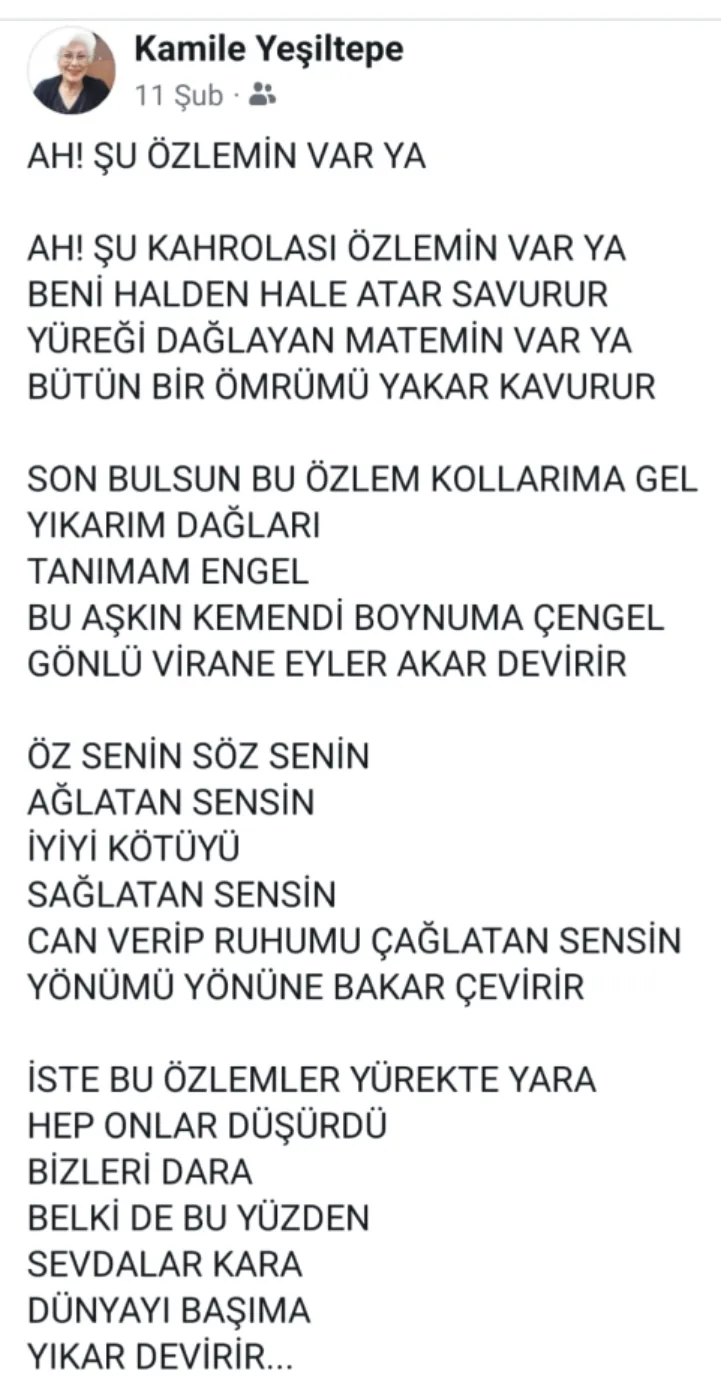 Kamile Yeşiltepe’nin sosyal medyasındaki son şiirlerinden biri