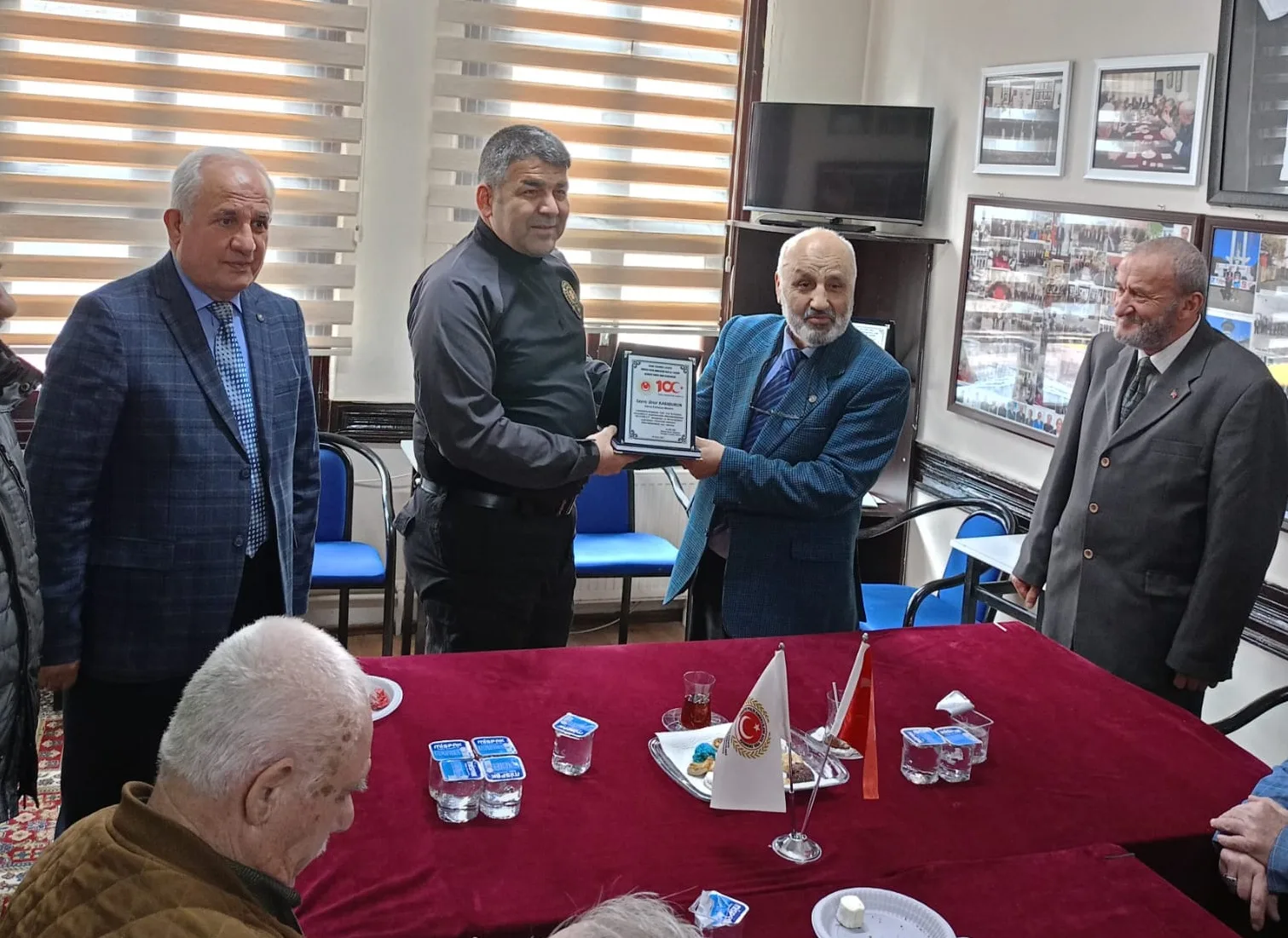 Şube Başkanı Bilgin, ziyaret dolayısıyla il Emniyet Müdürü Karaburun’a plaket takdim etti. Öte yandan Karaburun da, ziyarette Cumhuriyetimizin kuruluşunun 100. yılında dernek merkezinde üç gün süre ile açılan hüsnühat sergisinin açılışında emeği olan dernek üyesi emekli memuru Zafer Günal’a plaket verdi.