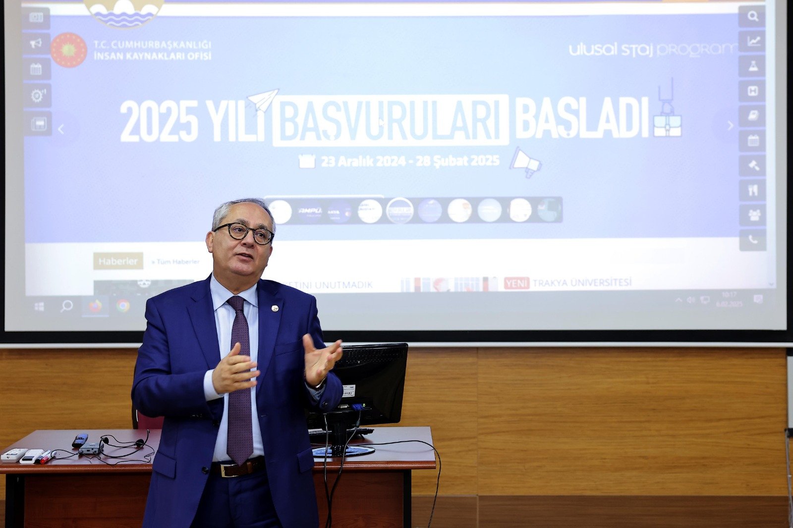 Trakya Üniversitesi ve Mesleki Yeterlilik Kurumu (MYK) iş birliğiyle, “AB Standartlarında Kariyer Gelişimi ve İş İmkânları” konulu eğitim toplantıları serisi düzenlendi. Farklı gruplara 3 ayrı oturum şeklinde yapılan ve Mesleki Yeterlilik Kurumu Başkanı Prof. Dr. Mustafa Necmi İlhan tarafından sunulan eğitim toplantısının ilki Tıp Fakültesi Ratip Kazancıgil Derslik Binasında, diğer ikisi ise Balkan Kongre Merkezi Senato Salonu’nda gerçekleştirildi.