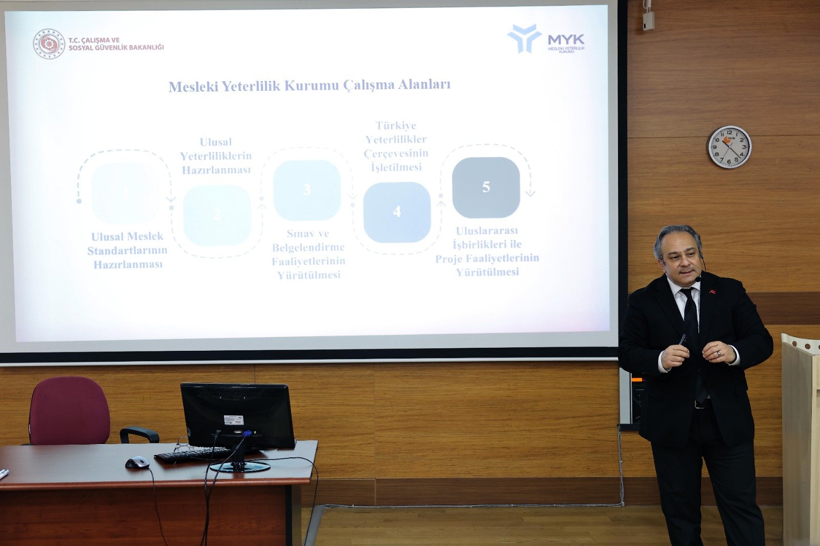 İlhan ayrıca TYÇ bağlamında kalite güvencesi, Türkiye Yeterlilikler Çerçevesi yönetim yapıları, yeterliliklerin TYÇ’ye yerleştirilmesi, TYÇ kapsamında gerçekleştirilen faaliyetler, mikro yeterliliğin tanımı ve önemi, mikro yeterlilik örnekleri, sınıflandırılmaları, mikro yeterliliklerin sosyal alan, eğitim ve iş hayatındaki etkileri ve Europass konu başlıklarına değindi.