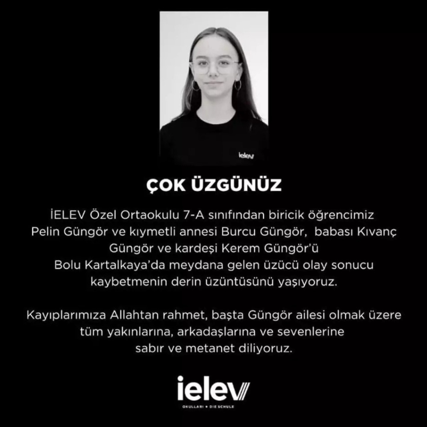 Ailenin kızları Pelin Güngör’ün ise İstanbul Erkek Liseliler Eğitim Vakfı (İELEV) Özel Ortaokulu 7’nci sınıf öğrencisi olduğu ifade edildi. İELEV Okulları taziye mesajı yayımladı.