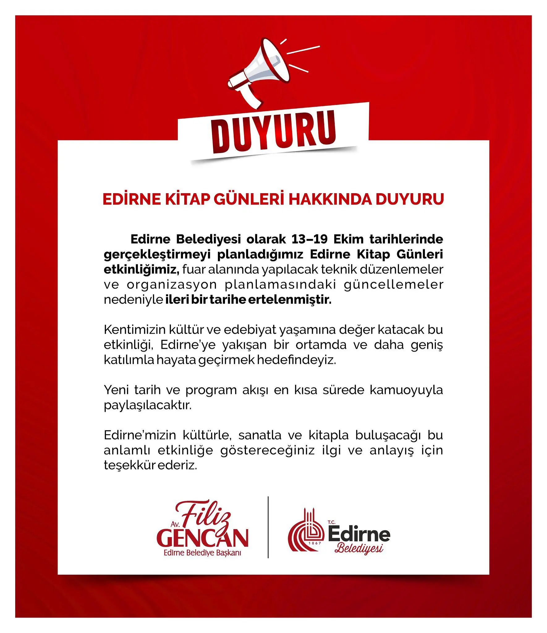 Edirne Belediyesi tarafından bu yıl 13–19 Ekim tarihleri arasında düzenlenmesi planlanan Edirne Kitap Günleri, yapılacak teknik düzenlemeler ve organizasyon planlamasındaki güncellemeler nedeniyle ileri bir tarihe ertelendi.