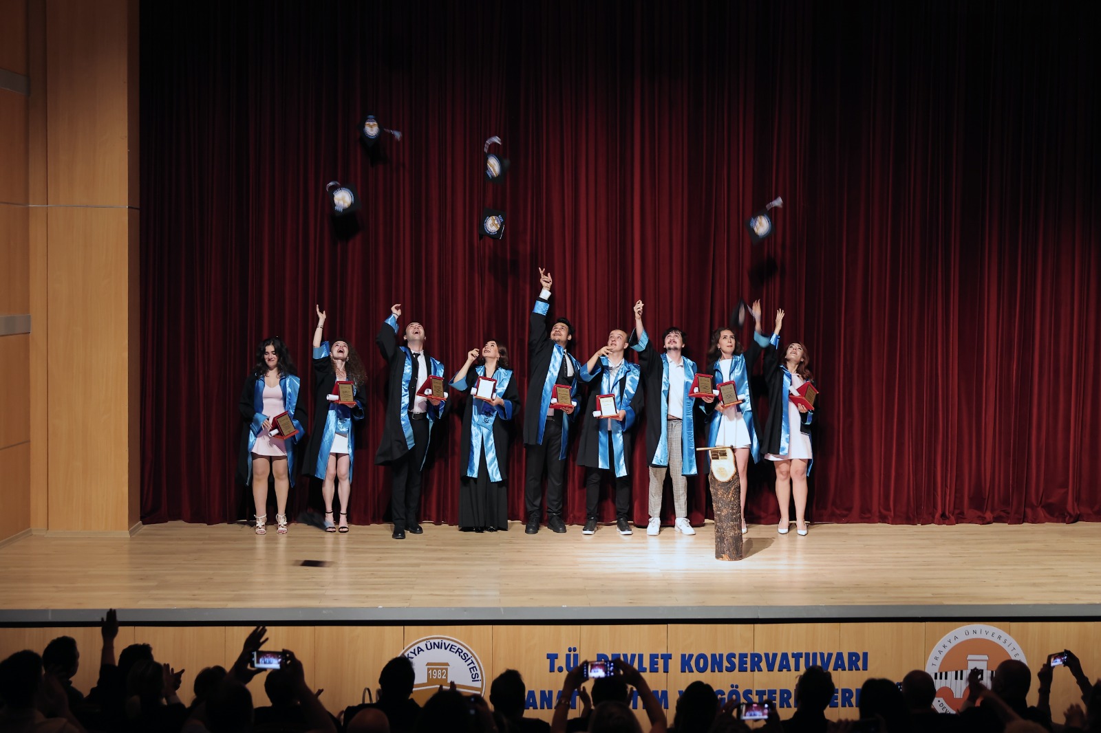 Devlet Konservatuvarı Sanat Eğitim ve Gösteri Merkezi’nde gerçekleştirilen mezuniyet törenine Rektör Yardımcısı Prof. Dr. Eylem Bayır, Devlet Konservatuvarı Müdürü Prof. Tanju Araboğlu, akademisyenler, öğrenciler ve aileleri katıldı.